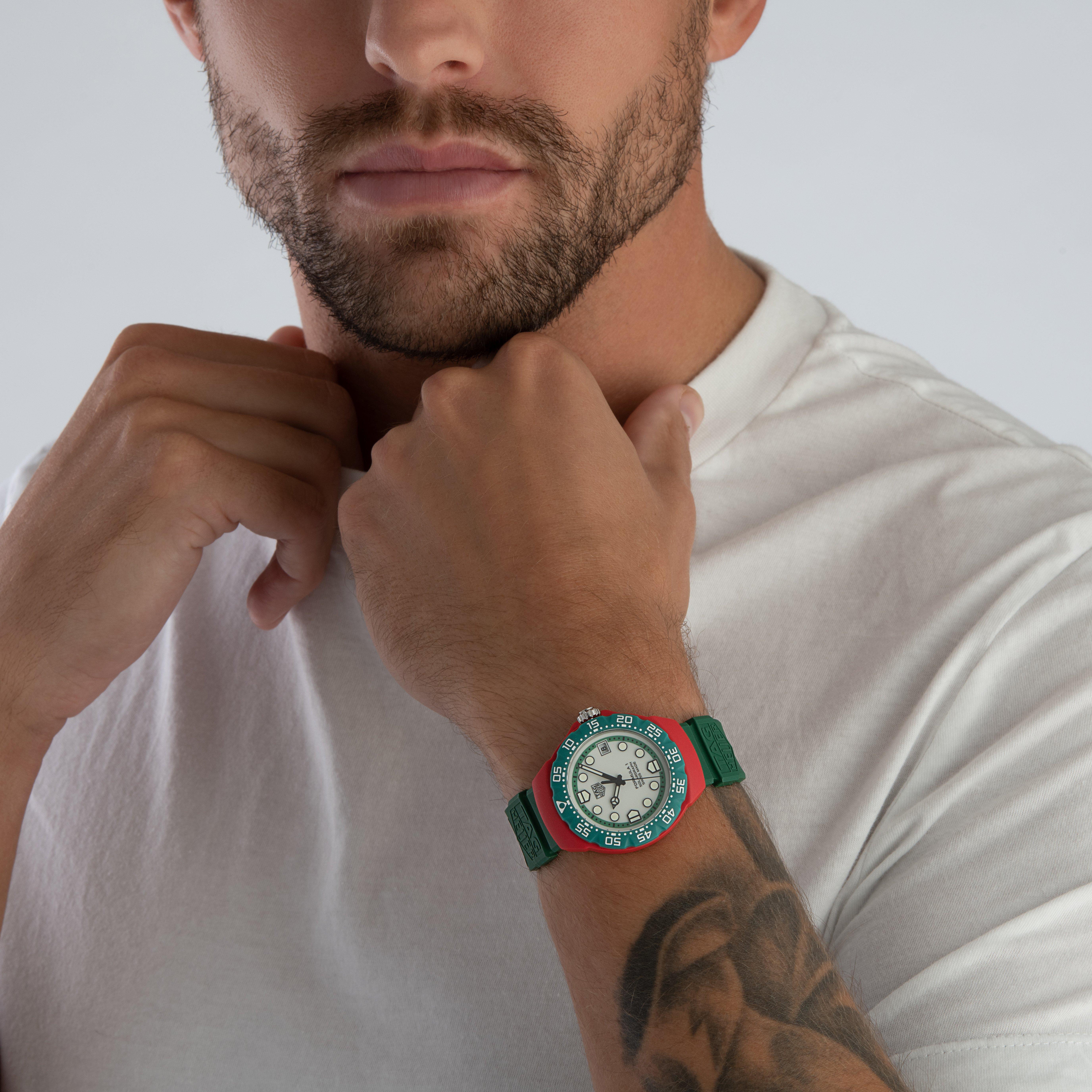 - Presented on a green rubber strap fastened with a steel pin buckle