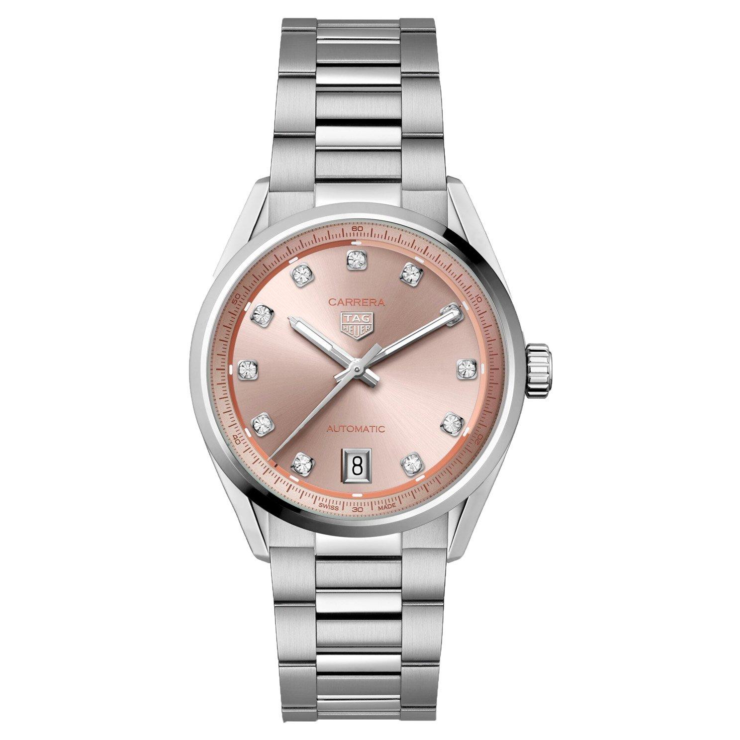 Combining elite watch-making craftsmanship with an enchanting powder-pink and diamond index dial as the centrepiece, this TAG Heuer Carrera Date 36mm Diamond Automatic Ladies Watch put a bold yet elegant twist on your every-day style. Designed with incredible functionality and a ground-breaking movement you can depend on, this timepiece is destined to adorn the wrist of those with a passion for luxury and immense quality.