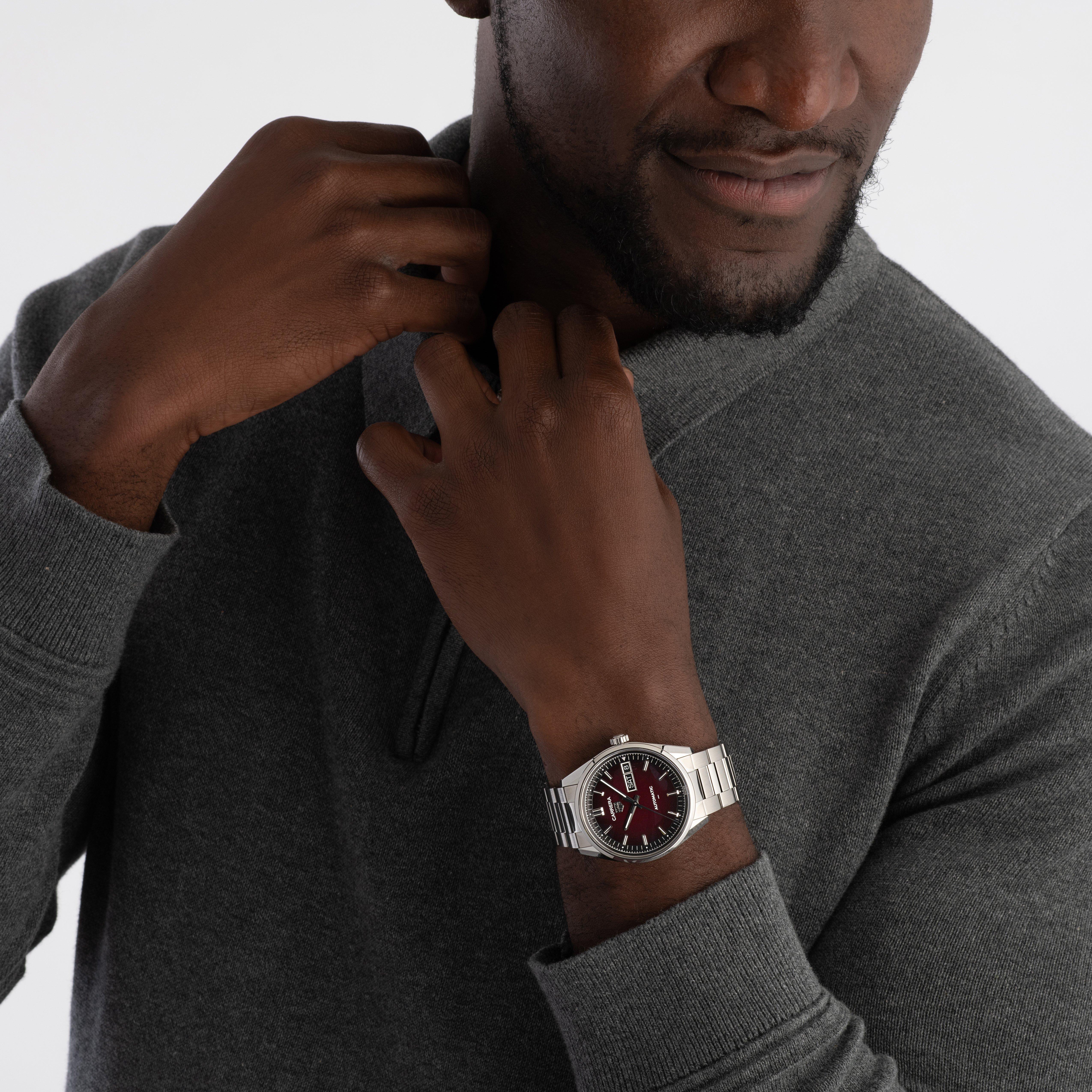 Add meticulous craftsmanship to your everyday ventures with this TAG Heuer Carrera Day Date 41mm Automatic Watch. Combining modern-day style with exceptional precision, this timepiece brings to life the very essence of outstanding watchmaking with its striking opalin dial, refined materials and groundbreaking movement.