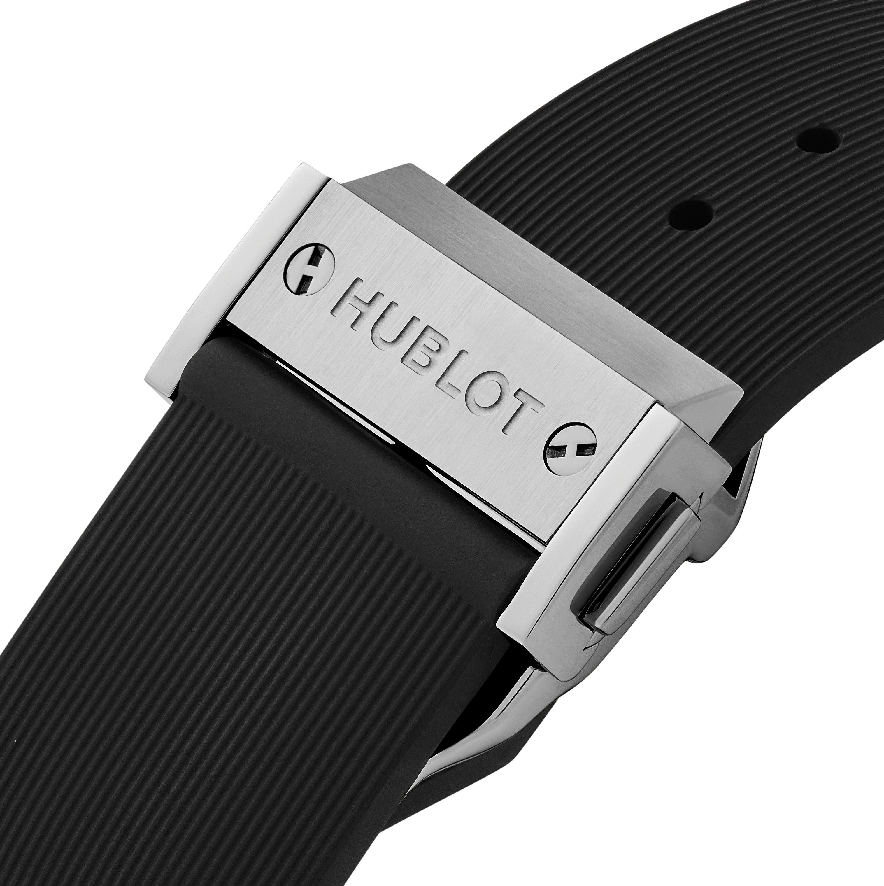 - Presented on a black lined rubber strap and fastened with a stainless steel deployment buckle clasp