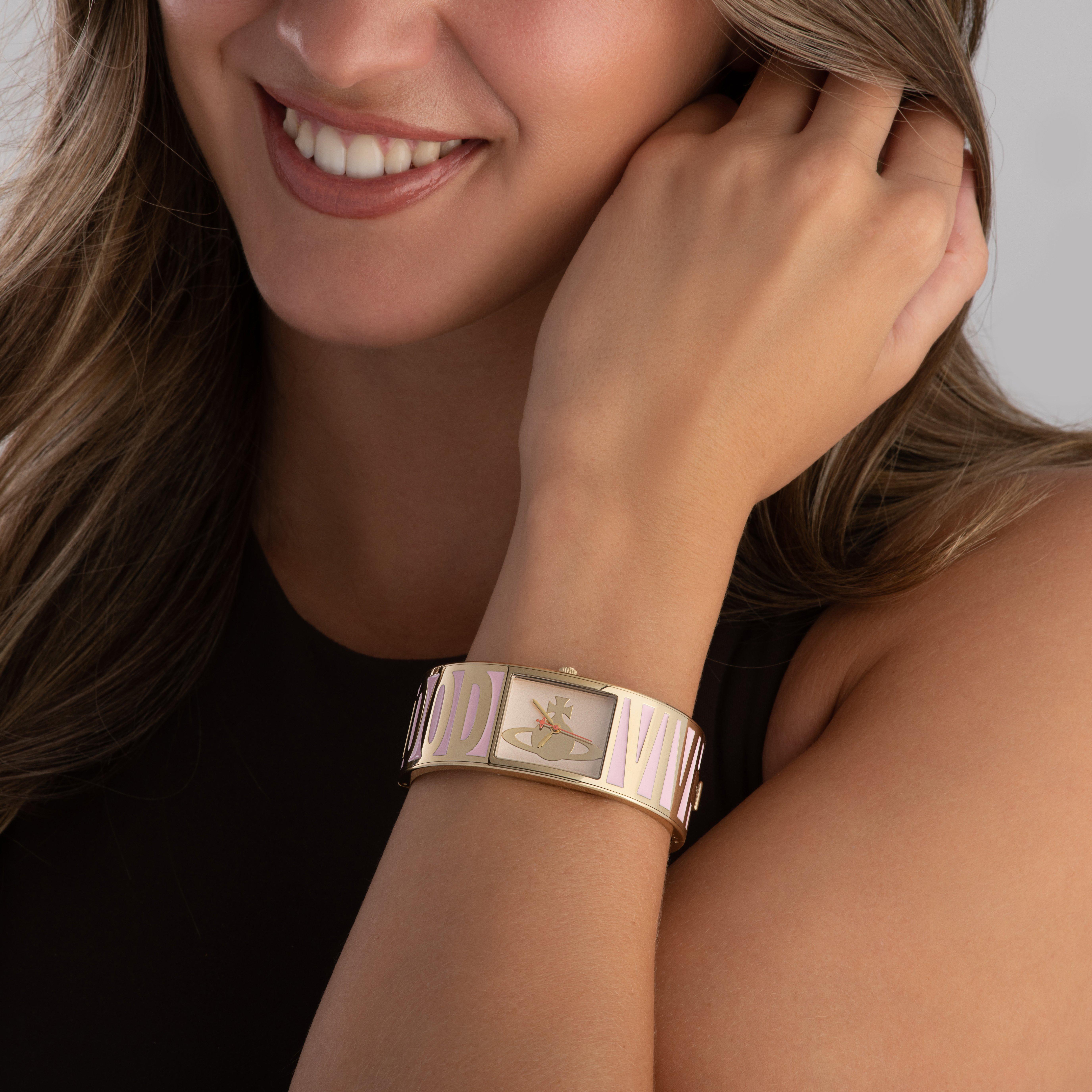 - Presented on a yellow gold tone stainless steel bangle, fastened with a press buckle