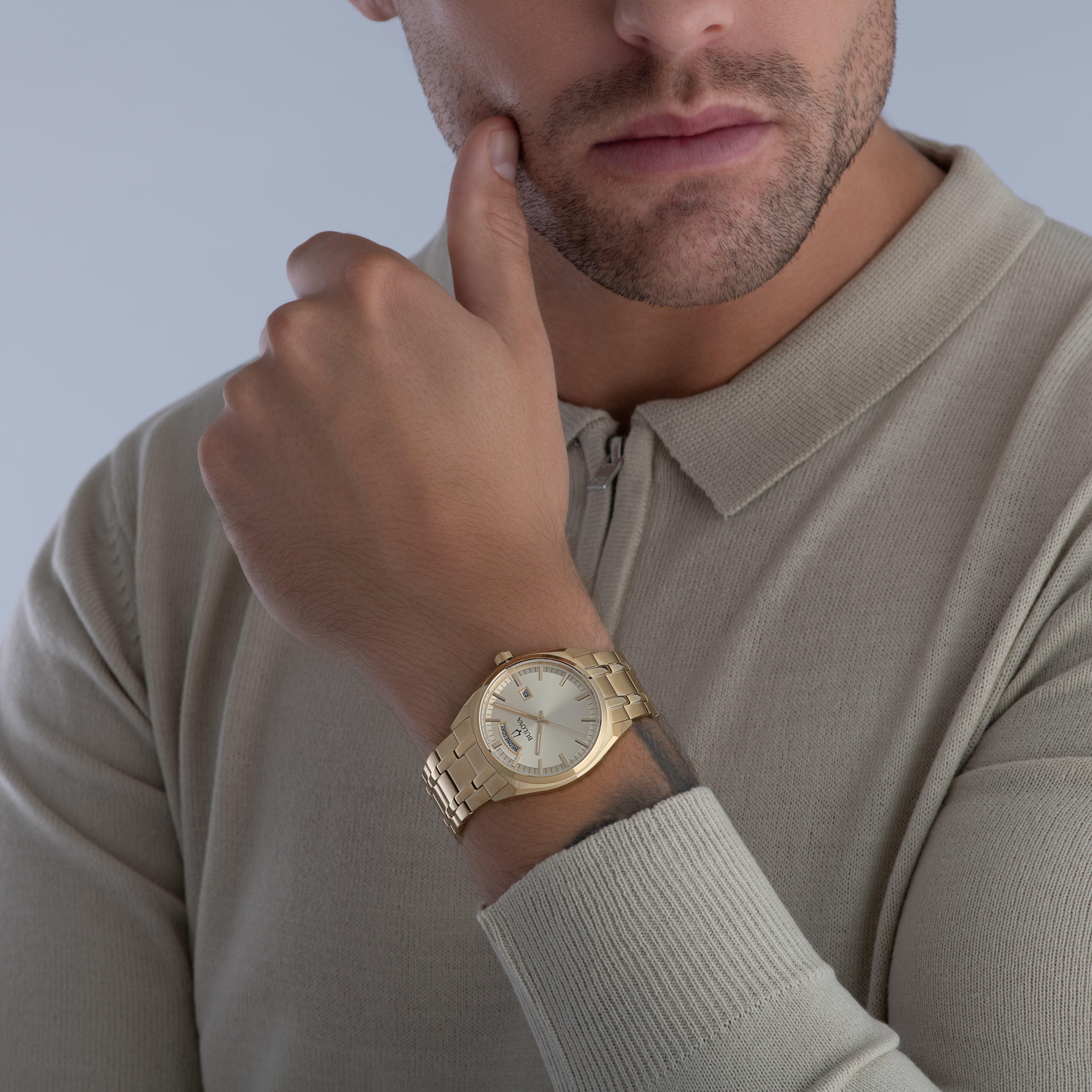 - 39mm yellow gold tone stainless steel case with 30m water resistance