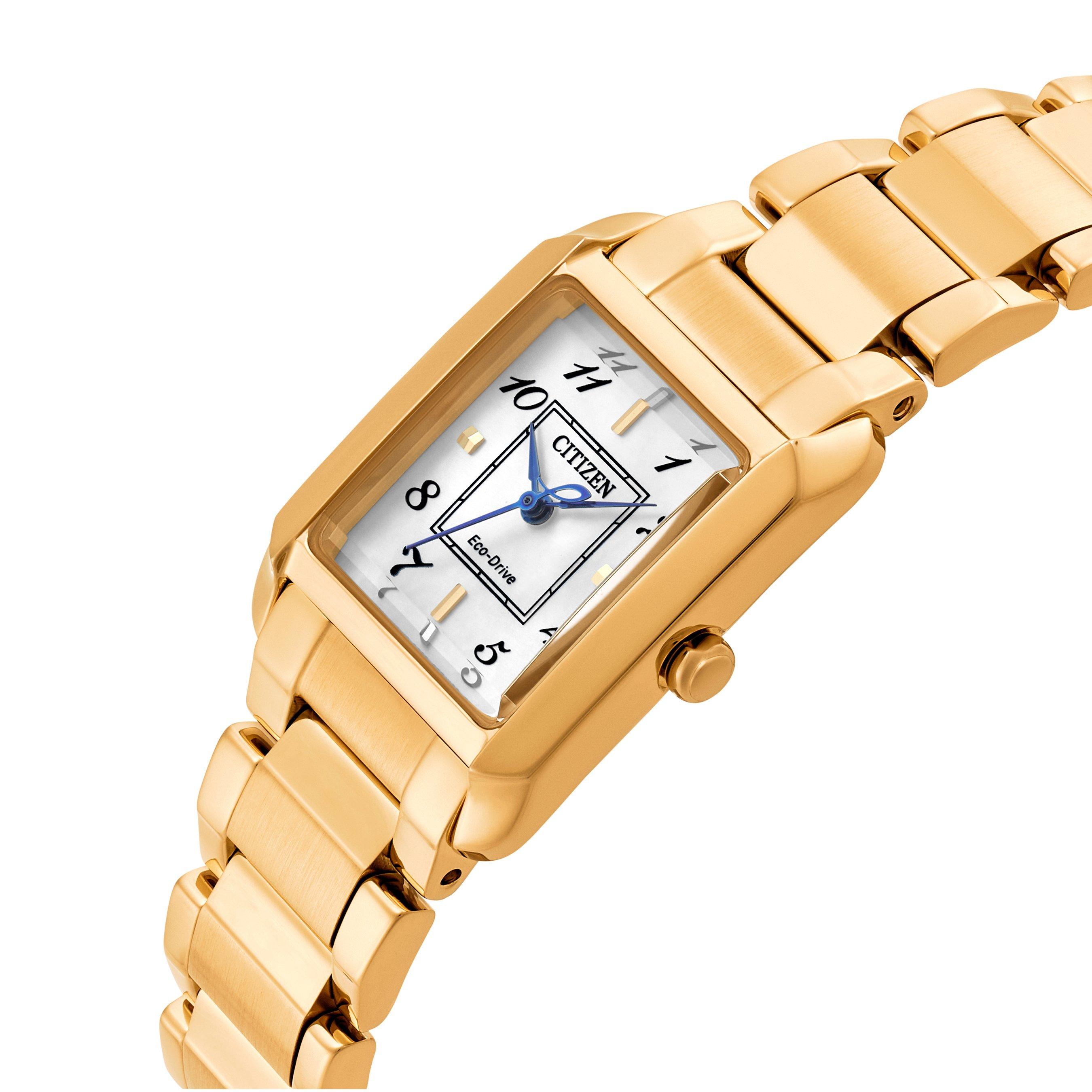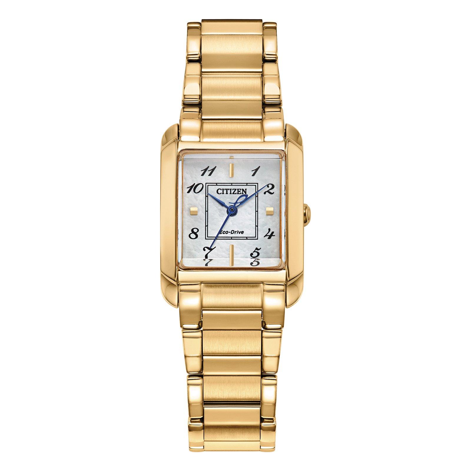 Adding a touch of timeless elegance to every occasion, this Citizen L Bianca 22mm Yellow Gold Tone Mother of Pearl Ladies Watch celebrates the feminine motifs in art deco.