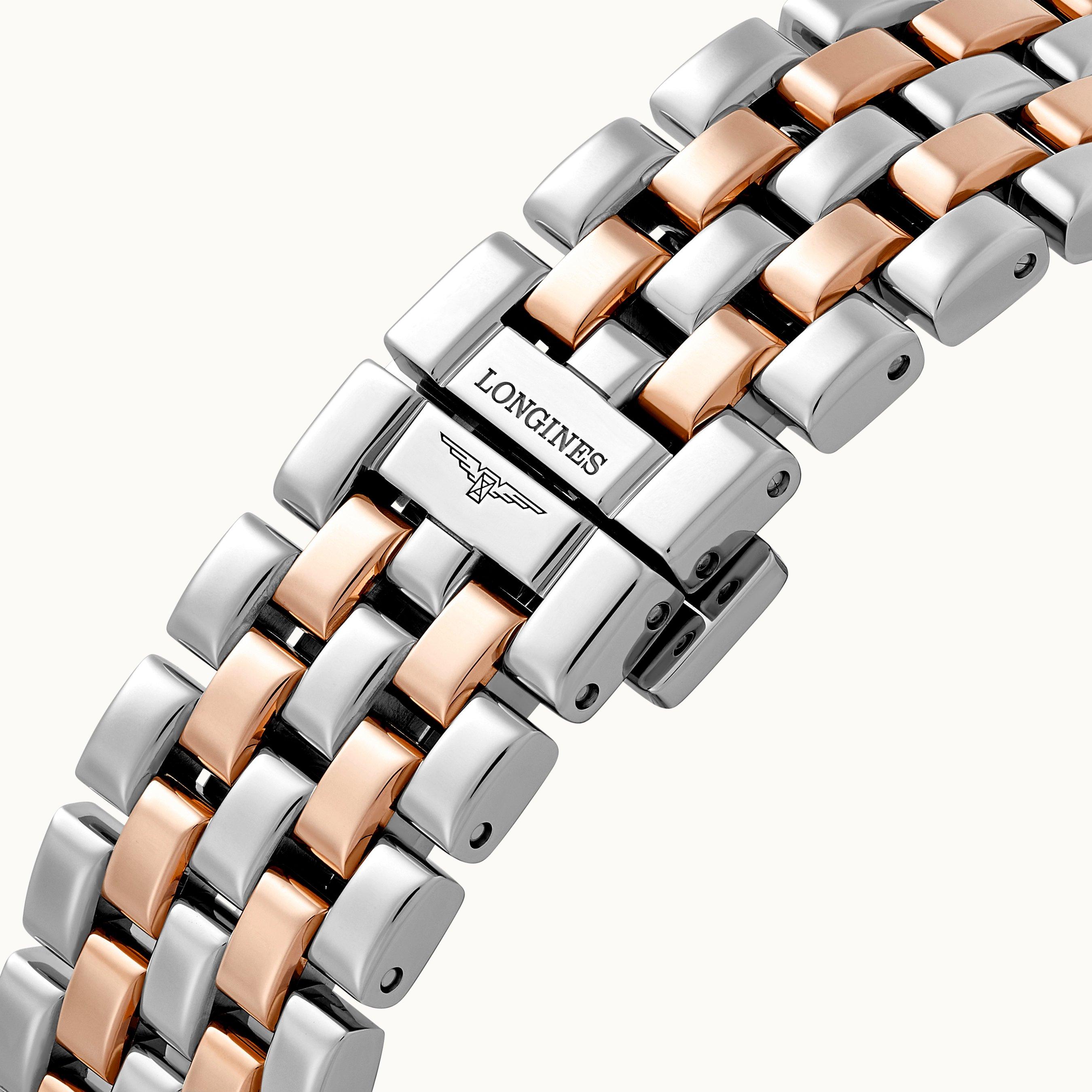 - Presented on a stainless steel and 18K pink gold bracelet fastened with a triple safety folding clasp