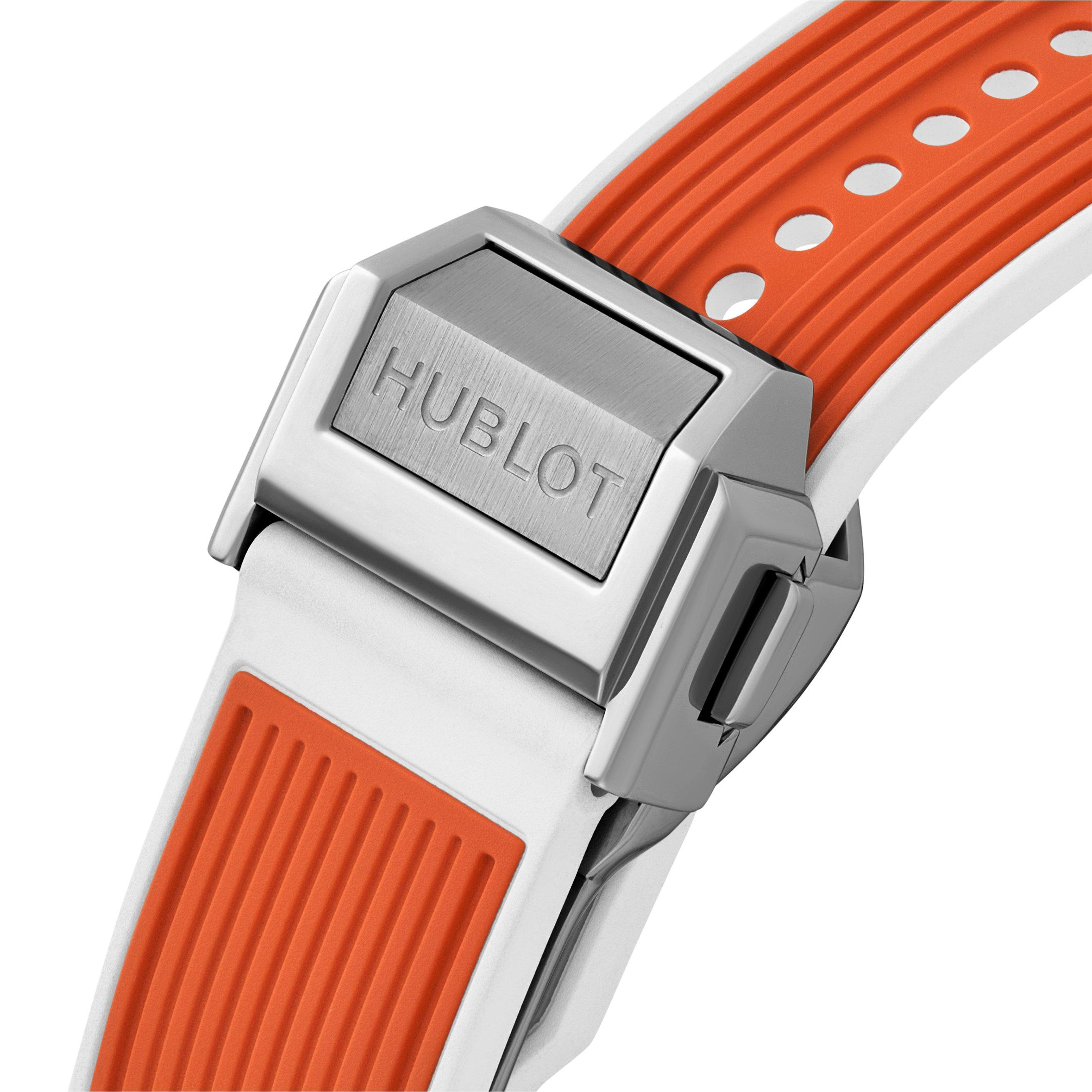 - Presented on a white and orange lined rubber strap, fastened with a stainless steel deployant buckle clasp