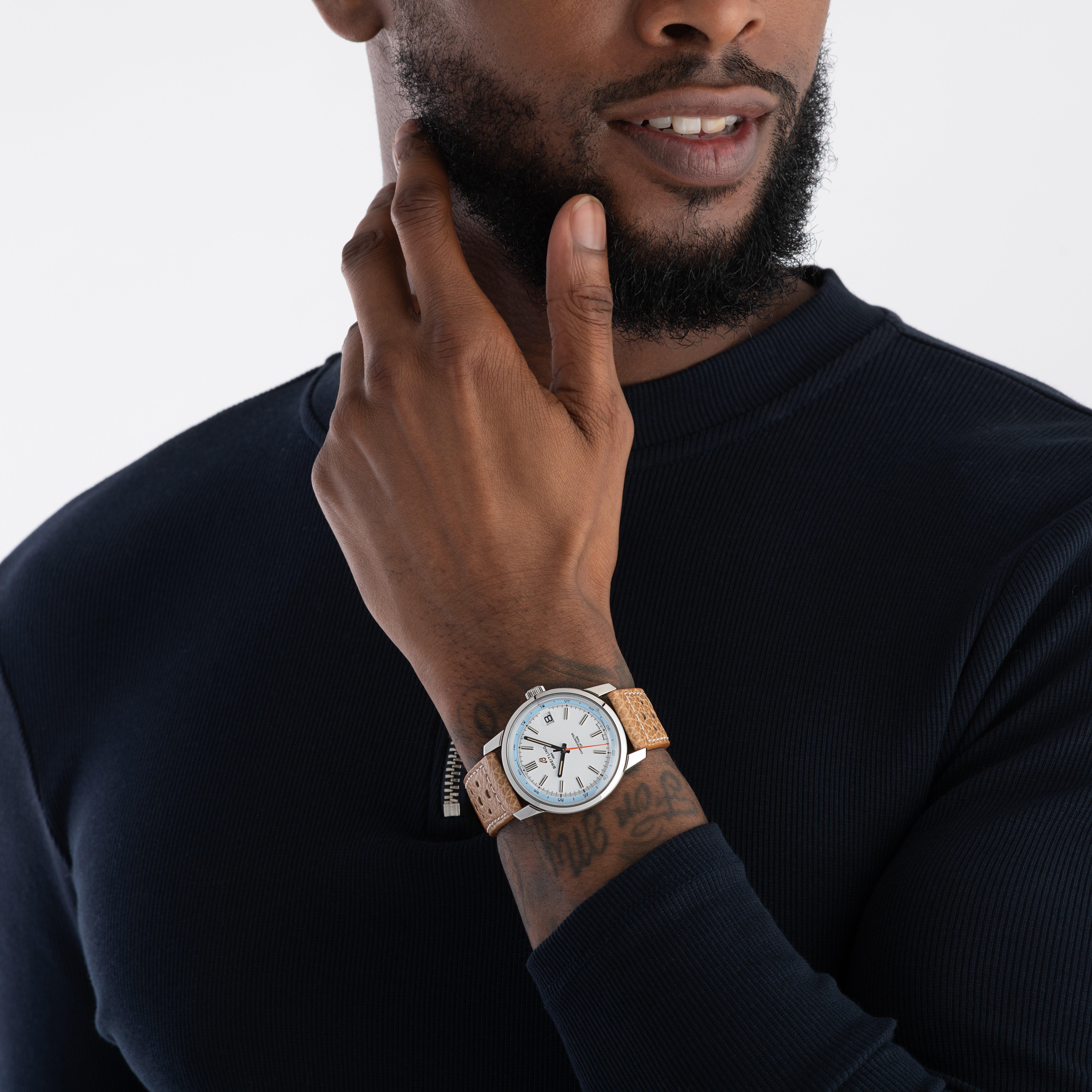 - Presented on a calfskin leather strap and fastened with a stainless steel tang-type buckle
