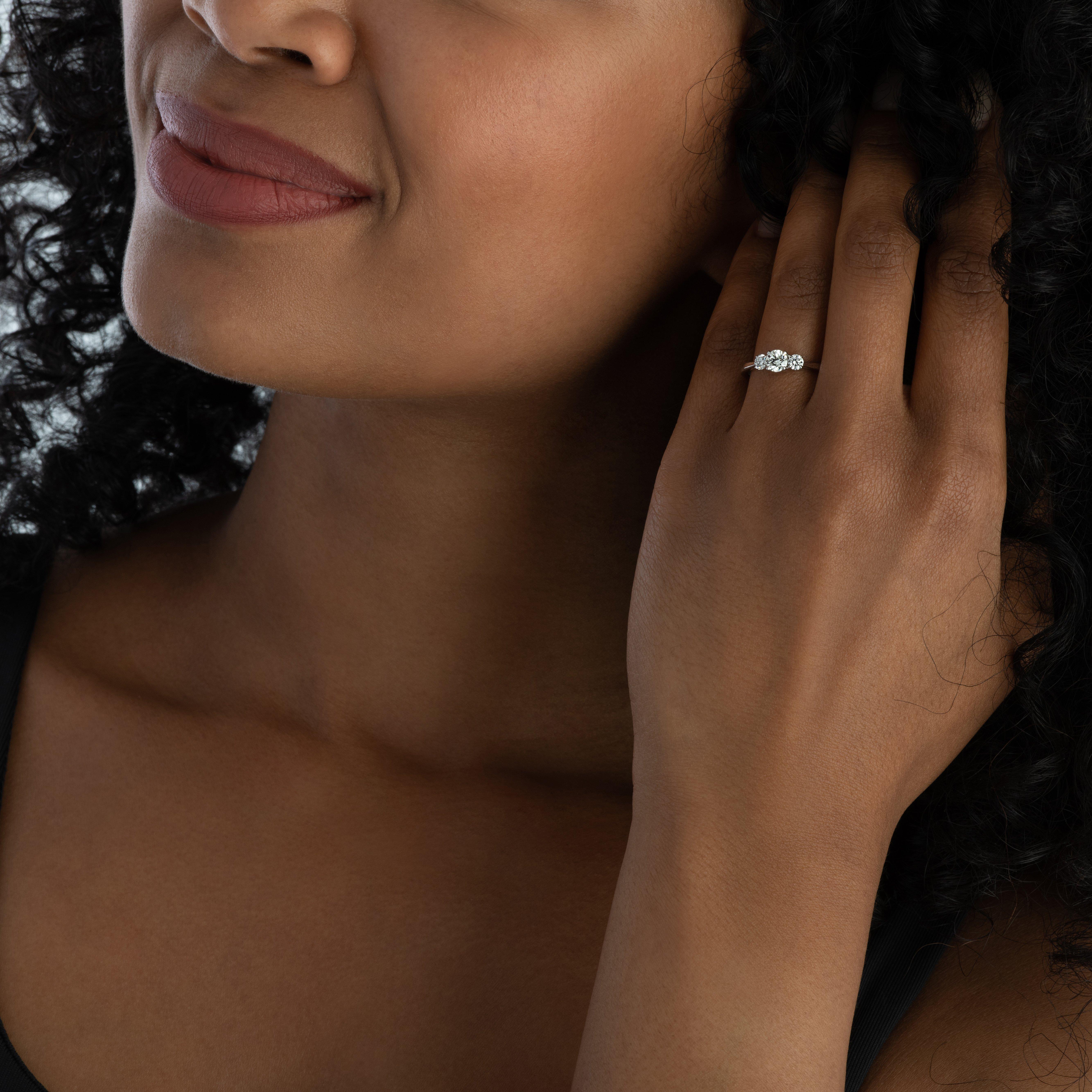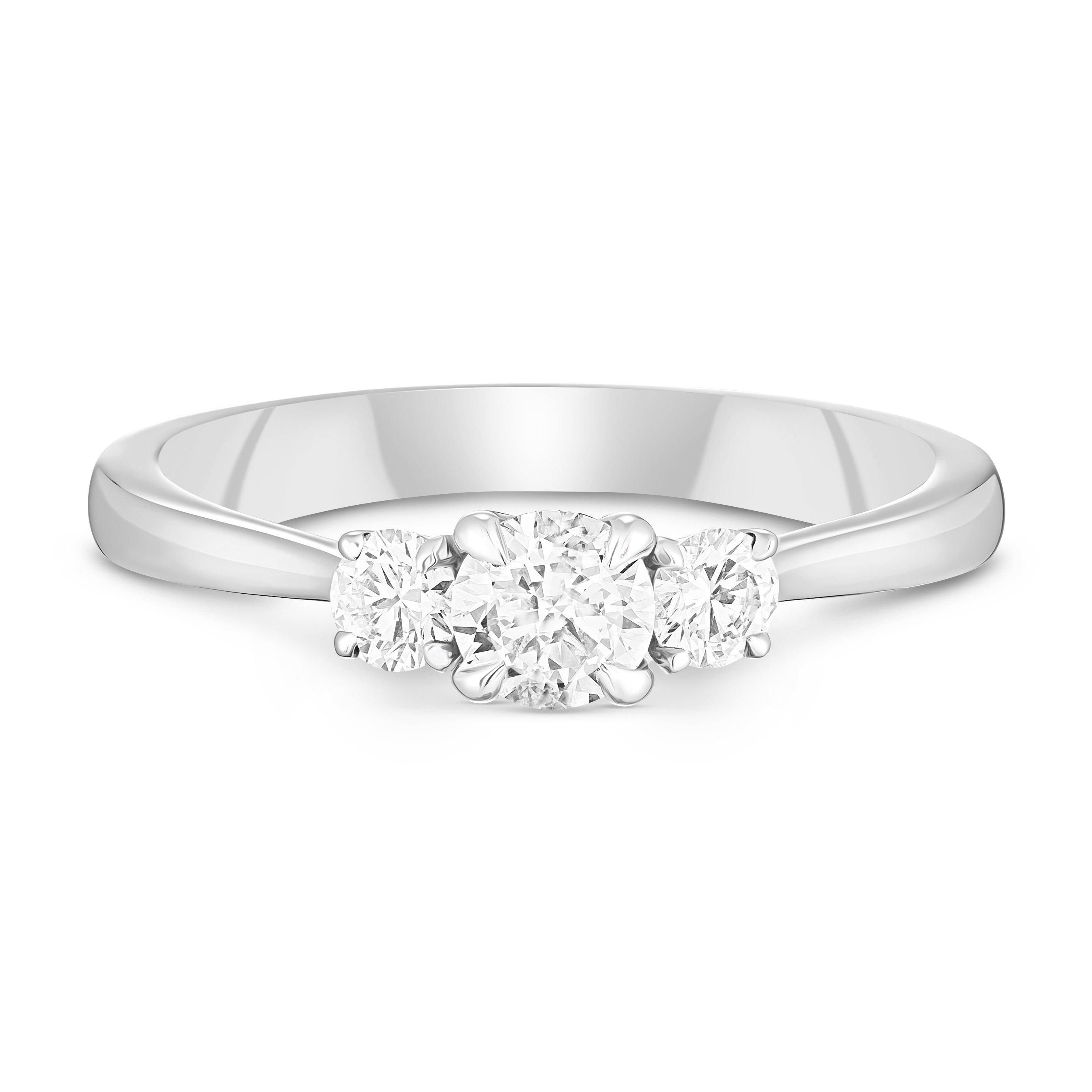 Designed to capture your love story, this Platinum Three Stone Diamond Engagement Ring radiates exceptional fire and brilliance. At its heart sits a 0.35 carat round brilliant diamond, elevated by two carefully selected diamonds to complete the trilogy, representing your past, present, and future together.