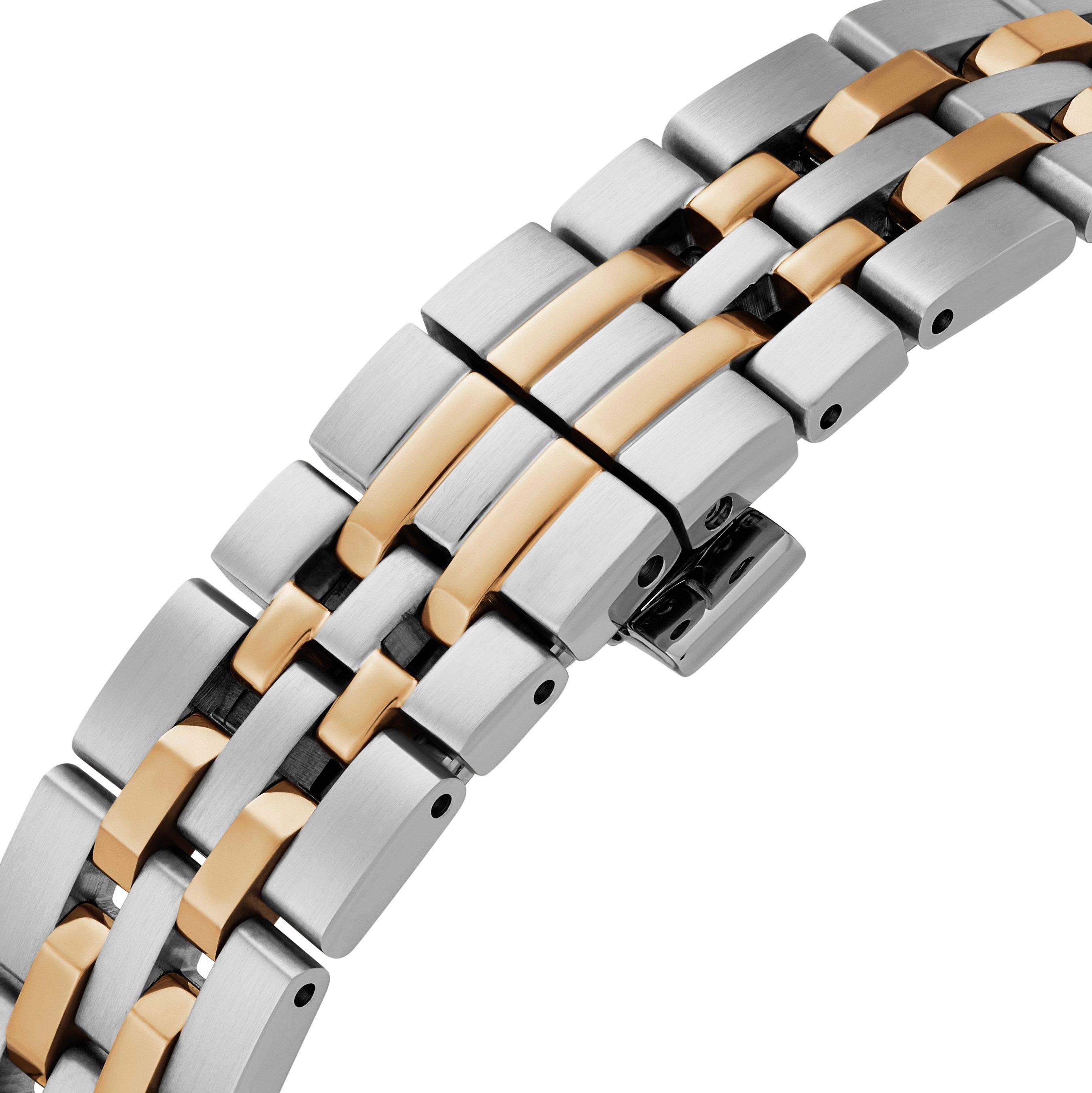 - Presented on a stainless steel and yellow gold tone bracelet, fastened with a deployment clasp with push-button release