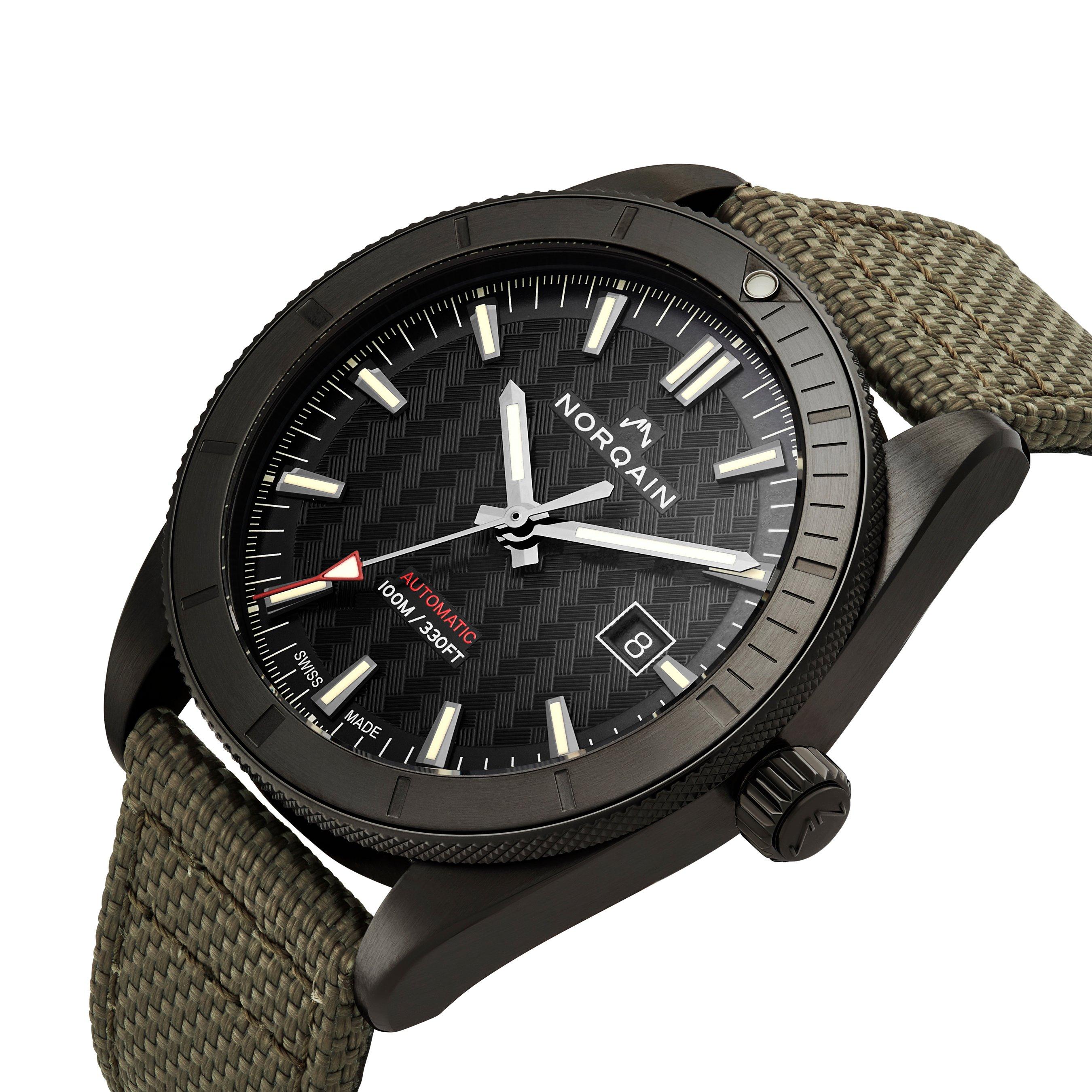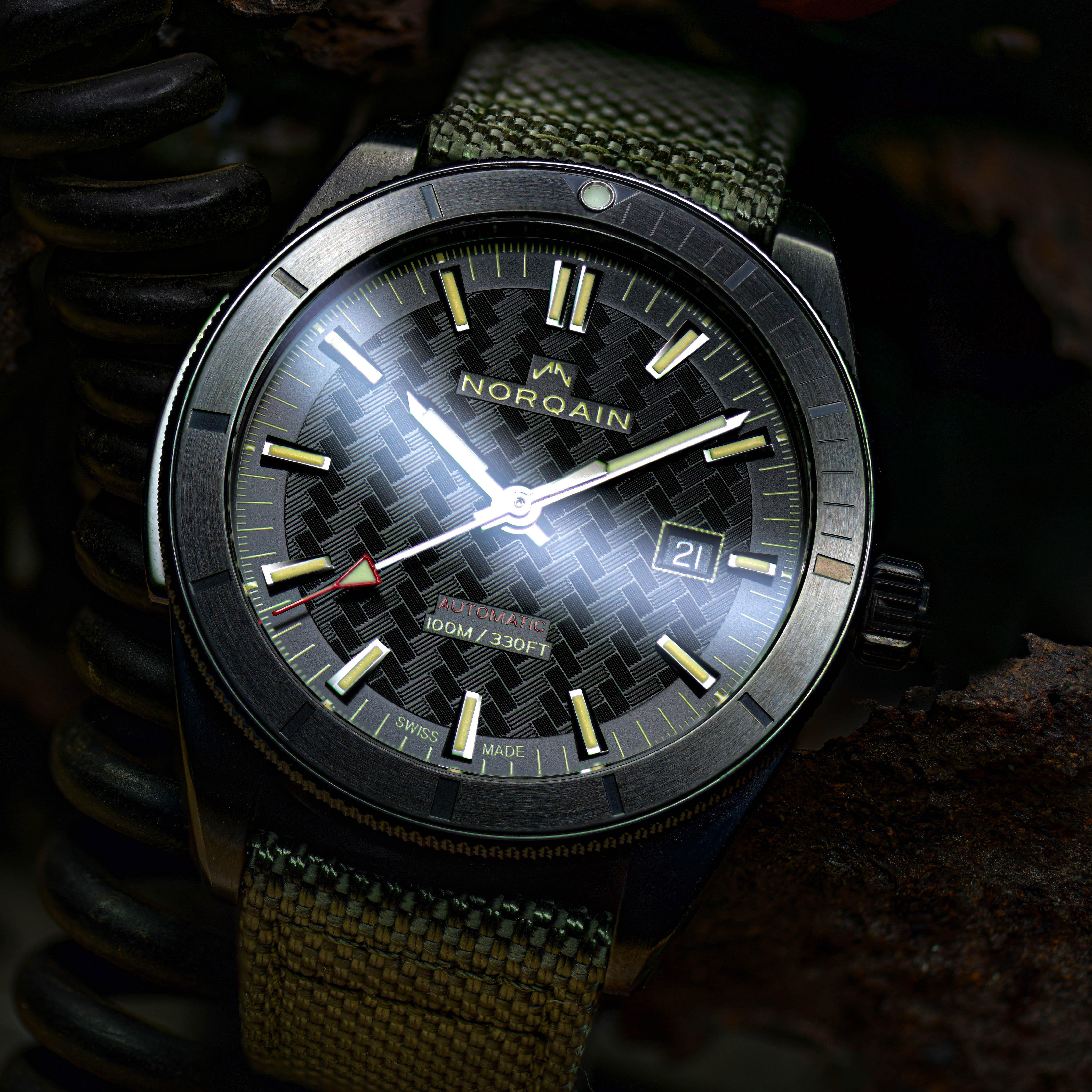 - Black dial with unique NORQAIN pattern, diamond-cut, faceted, black plated hands and indexes filled with Old Radium Super-LumiNova