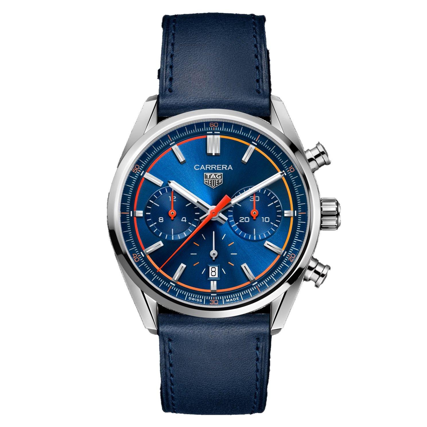 This Pre-Owned TAG Heuer Carrera 42mm Chronograph Automatic Men’s Watch has been expertly crafted to deliver a modern and dynamic timepiece features a striking orange gradient ring and vivid touches paired with an intense blue dial and calfskin leather strap, making a statement of elegance and enduring strength.