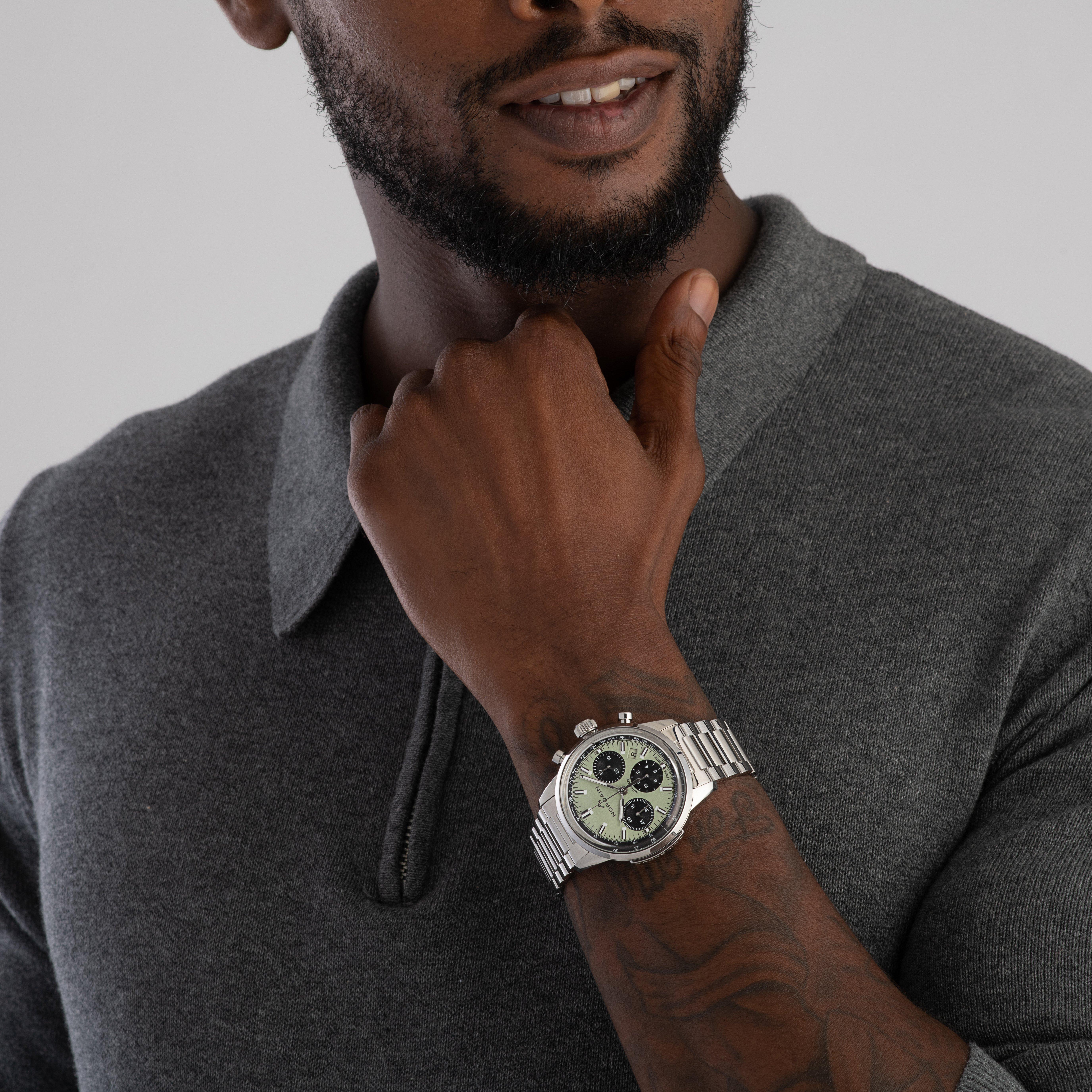 - Pistachio-coloured dial with sunray finish, white tachymeter scale on a black outer ring, diamond-cut flat indexes, with white printing and white Super-LumiNova® and diamond-cut faceted hour and minute hands, filled with white Super-LumiNova®