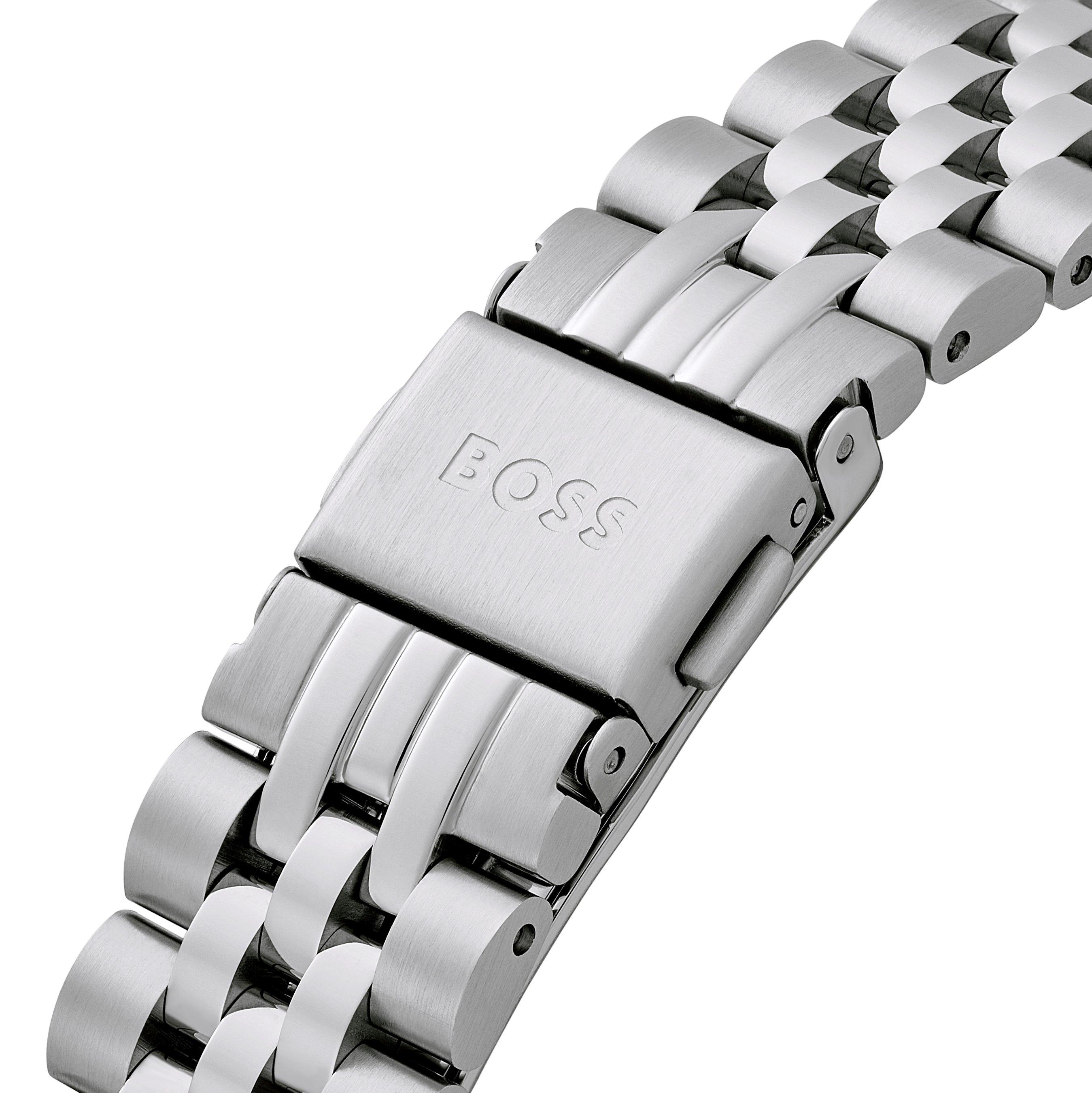 Presented on a stainless steel bracelet and fastened with a deployment clasp with push button