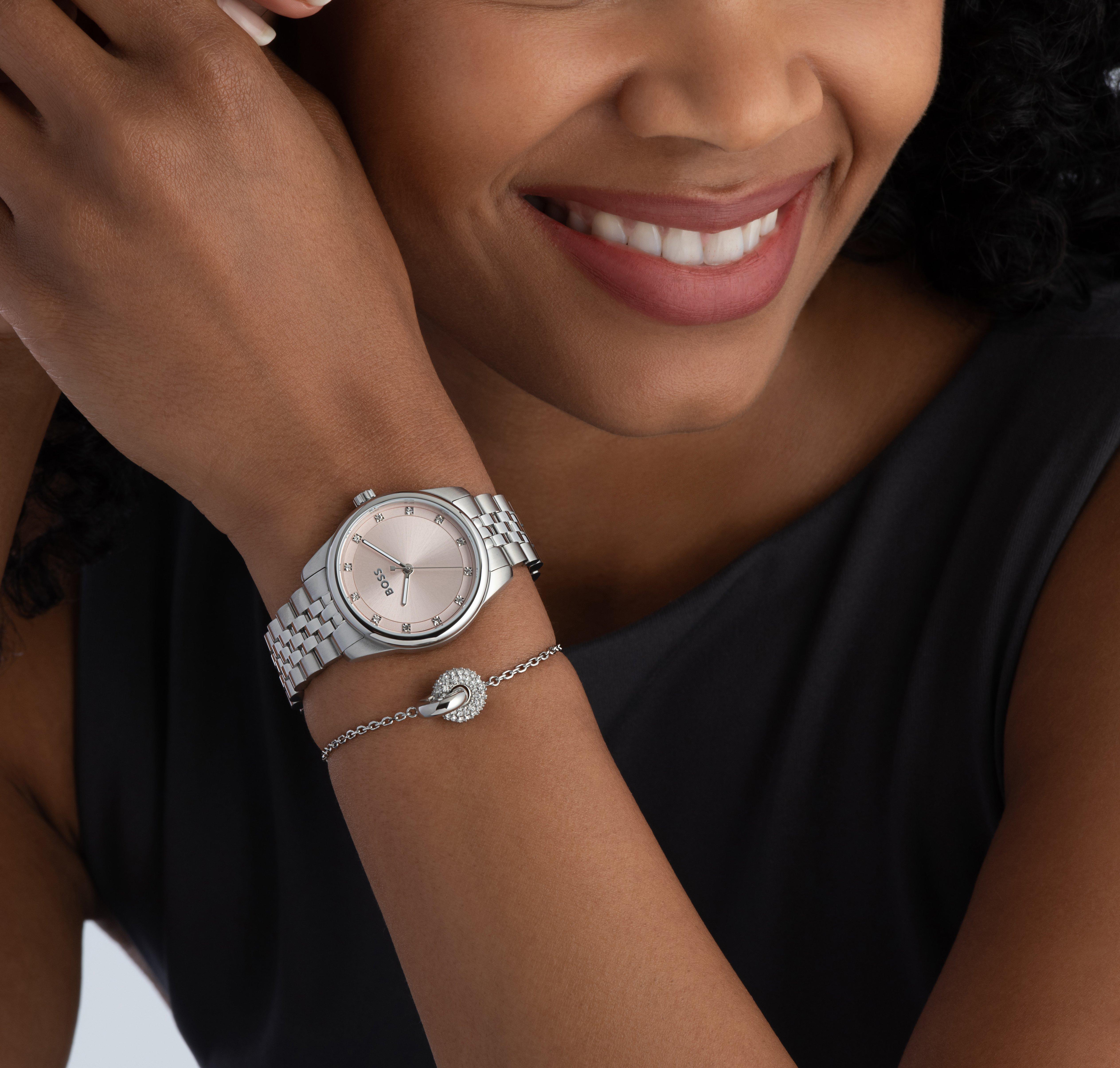 Add a touch of modern elegance to every look with this BOSS Graceful 32mm Stainless Steel Ladies Watch and Bracelet Set, the perfect gift for someone special or as a treat to yourself.