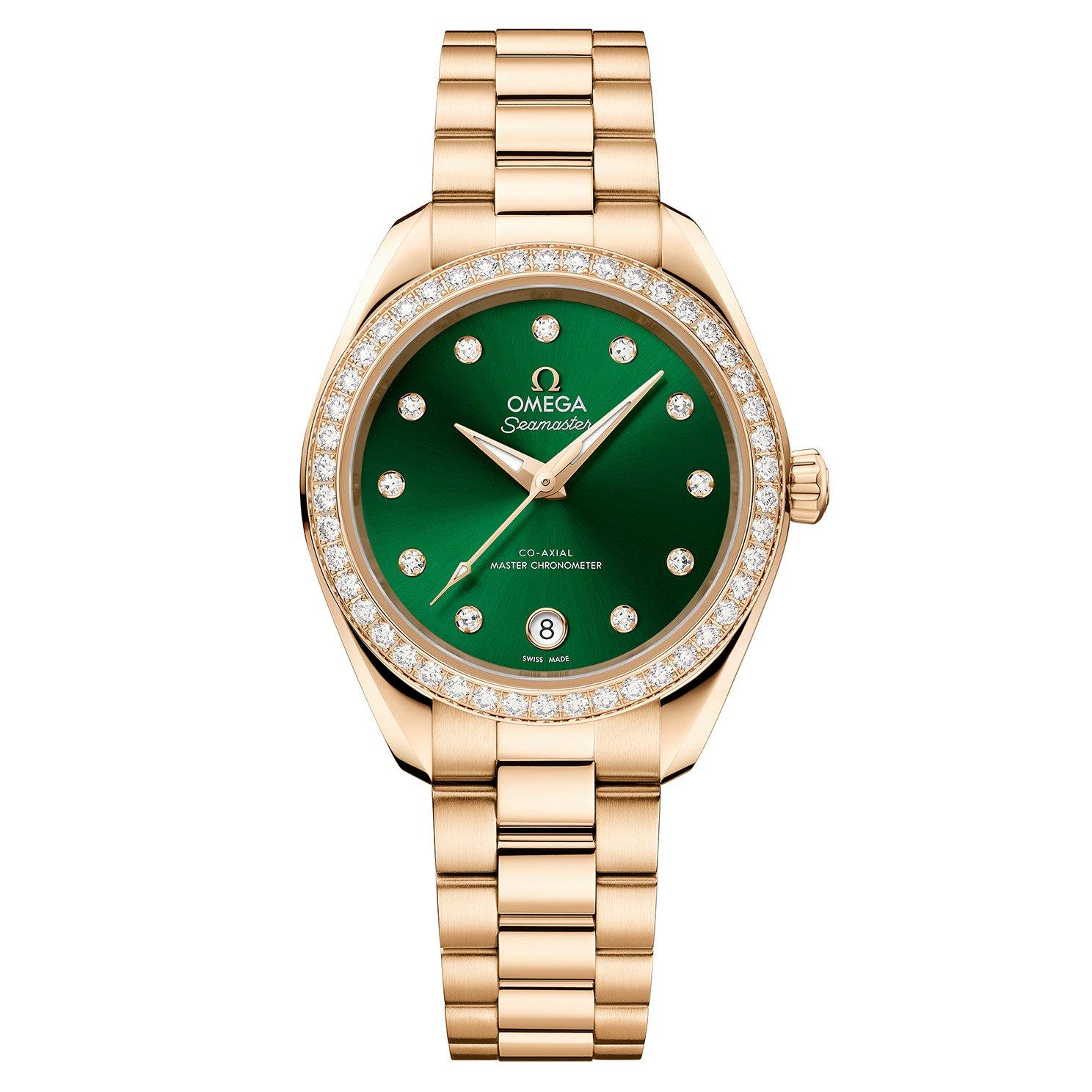 - Green sun-brushed and coloured dial with tinted lacquer, 18K Moonshine™ gold hands filled with white Super-LumiNova and 11 diamond hour makers, framed by a diamond bezel