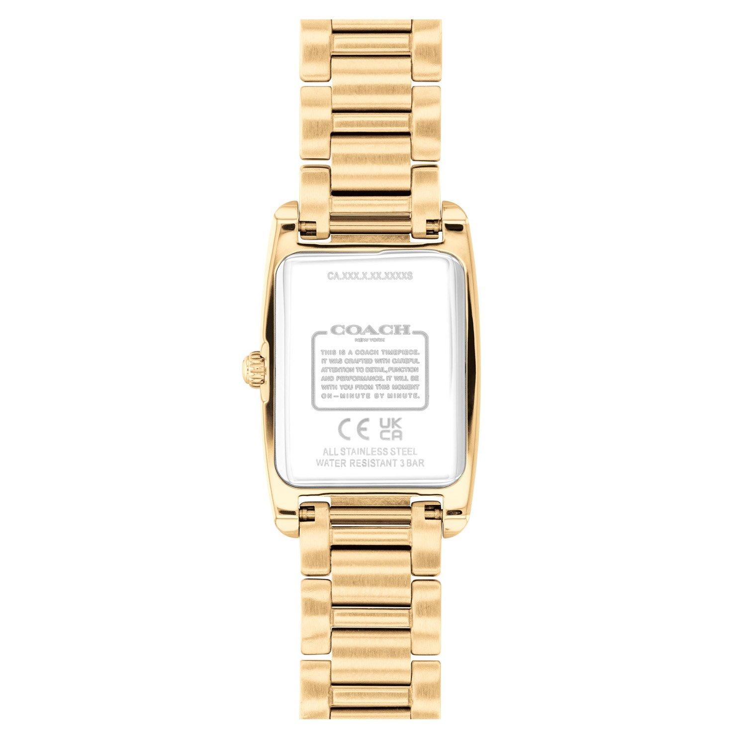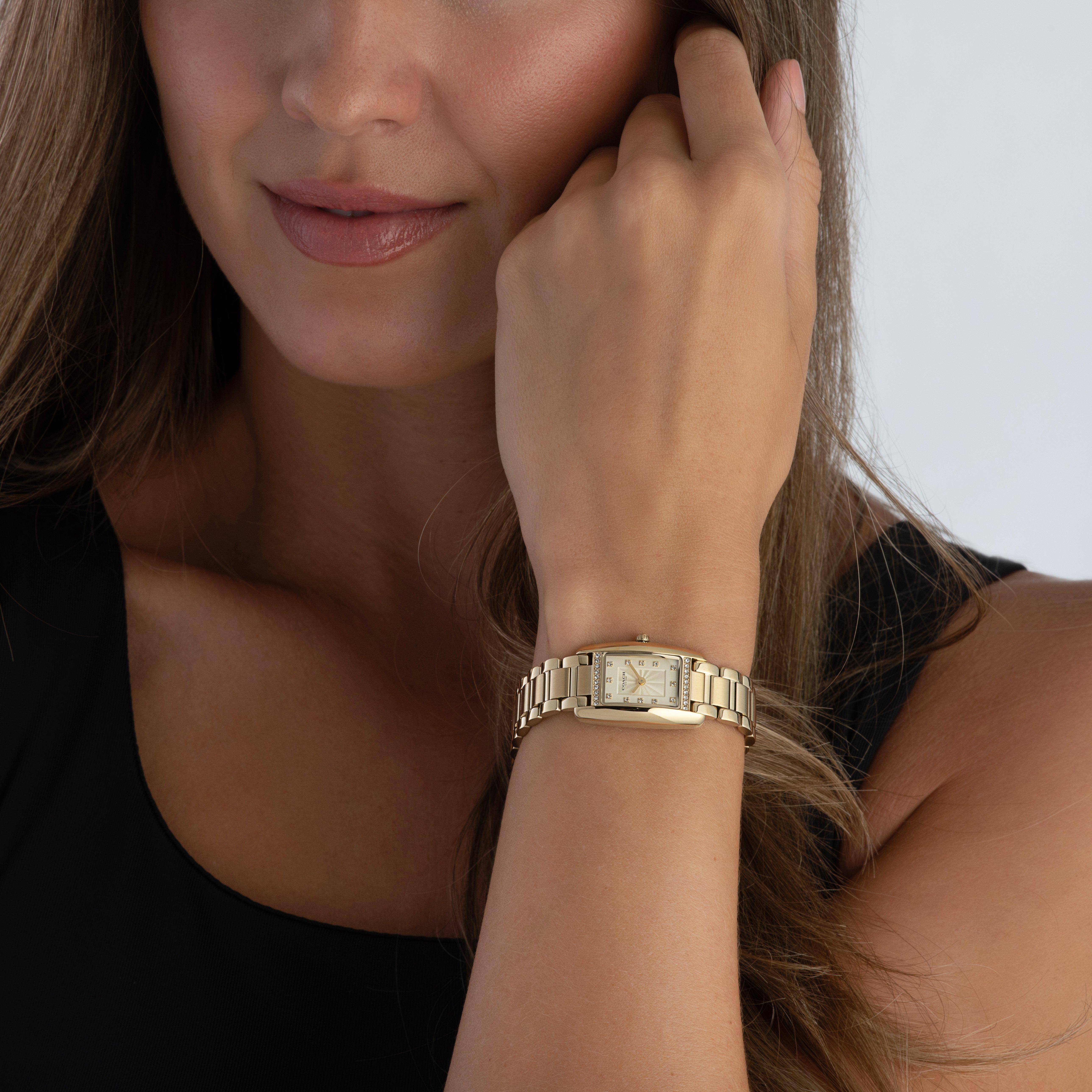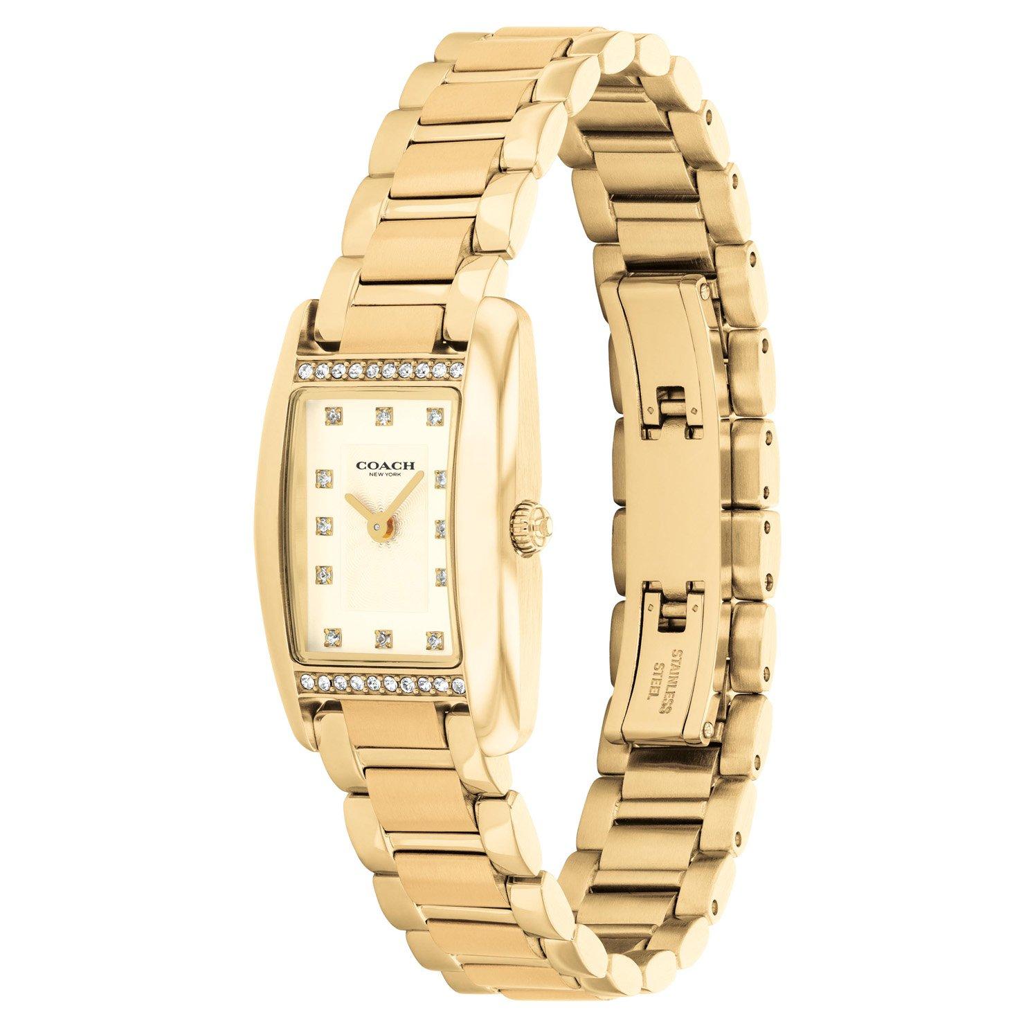 - Gold-tone dial with yellow gold-tone stainless steel hands and crystal indexes