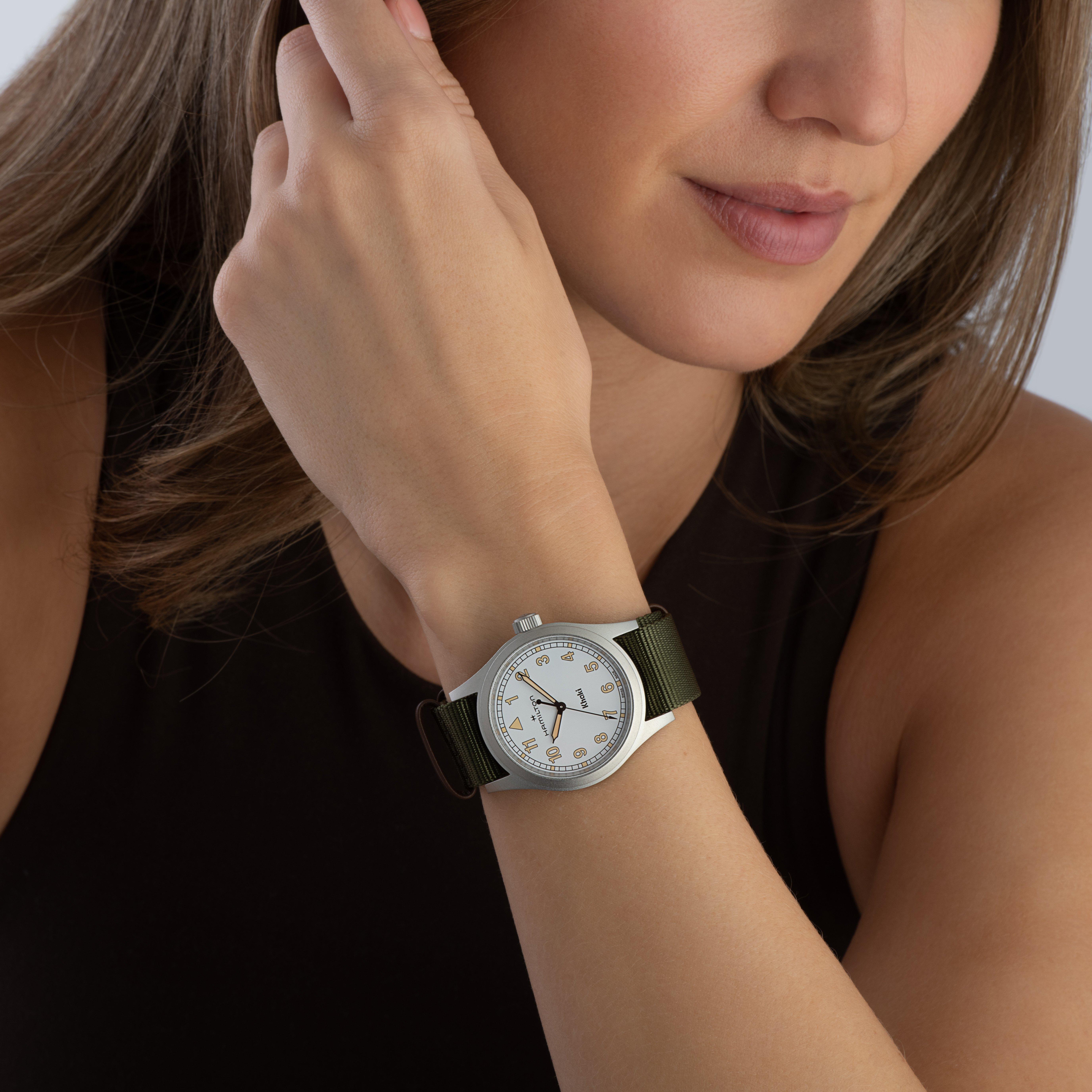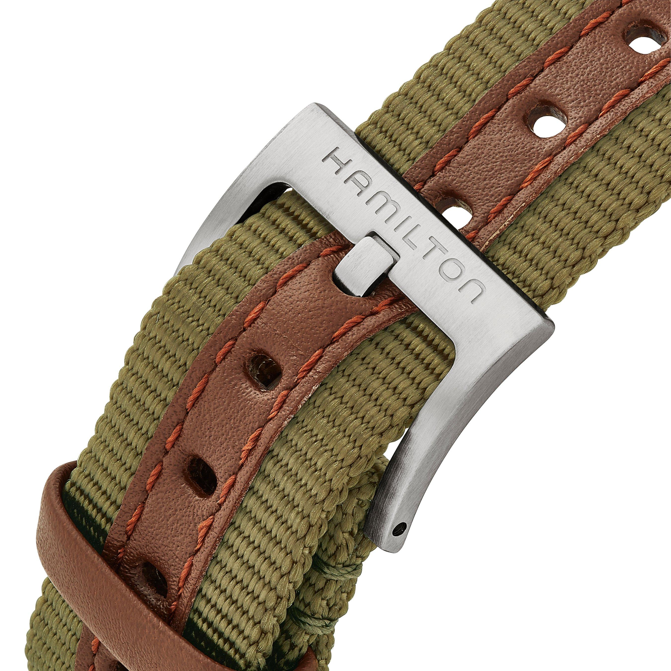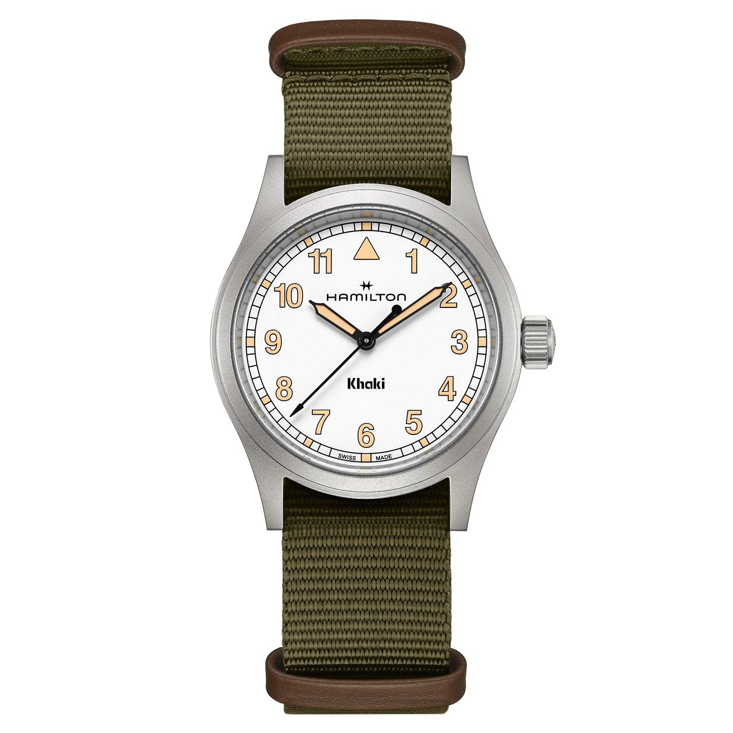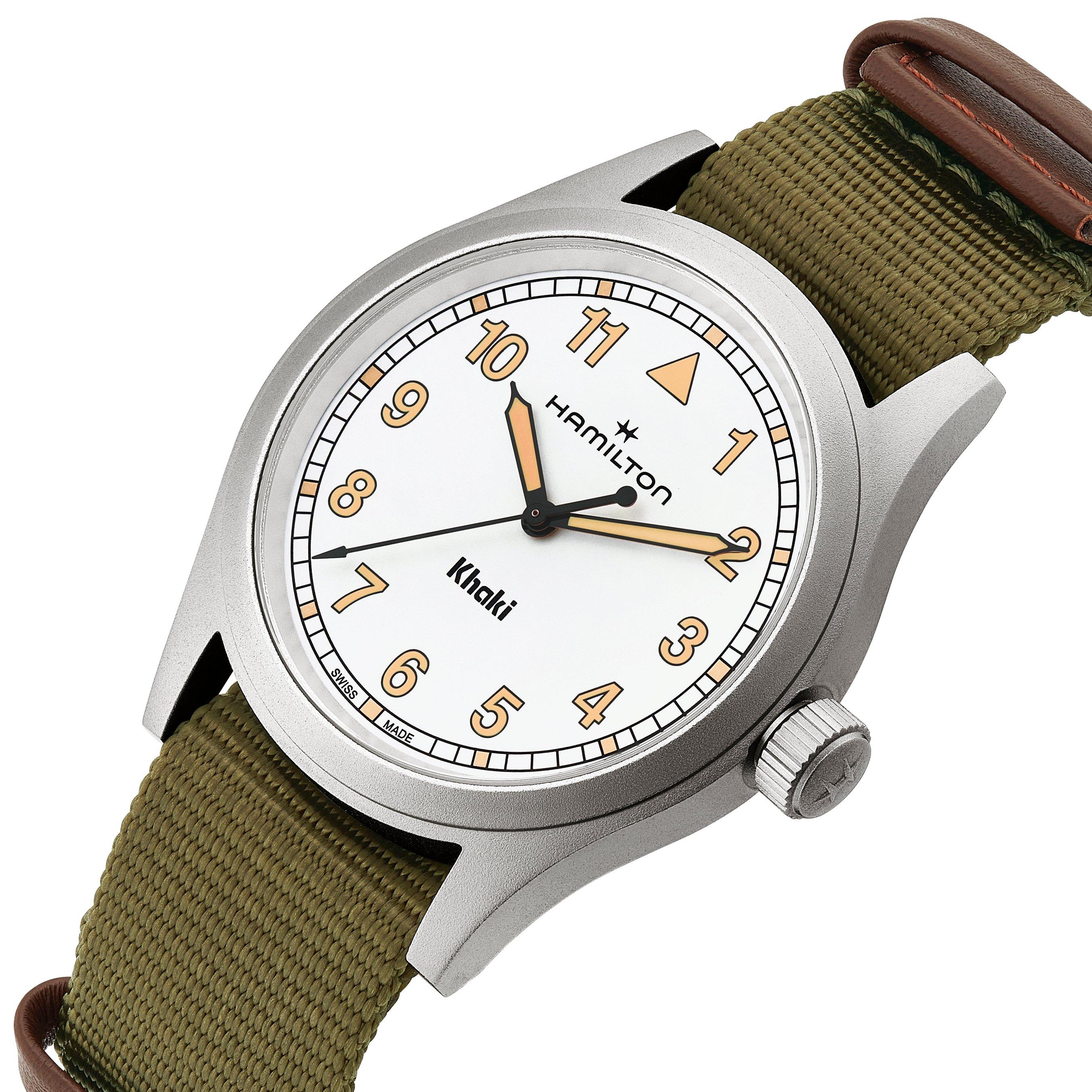 Bringing to life the brand’s rich military heritage, this Hamilton Khaki Field 38mm Watch features a ‘railway’ minutes track and a green textile NATO strap that provides an understated yet stylish companion for every occasion.
