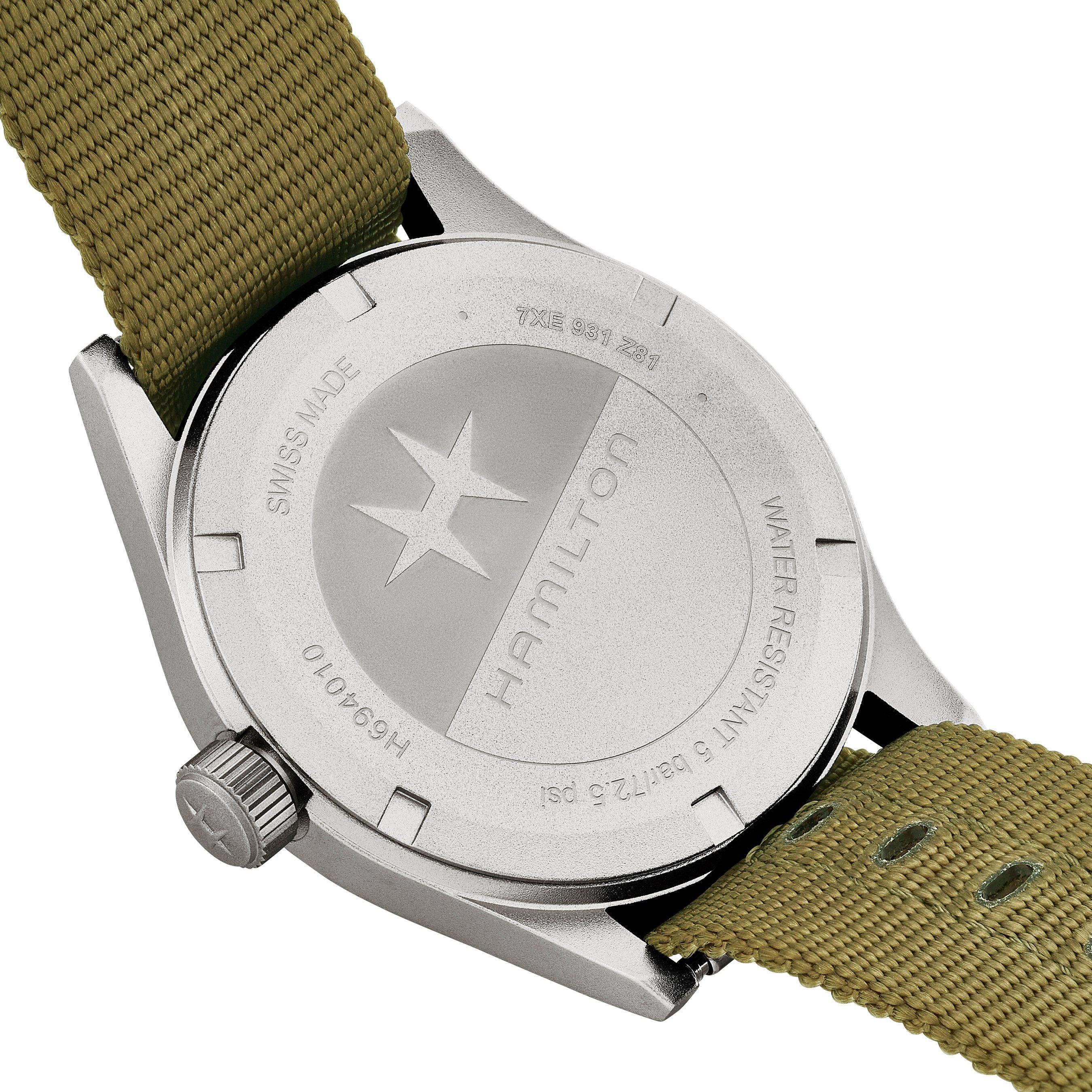 - Presented on a green textile NATO strap fastened with a pin buckle