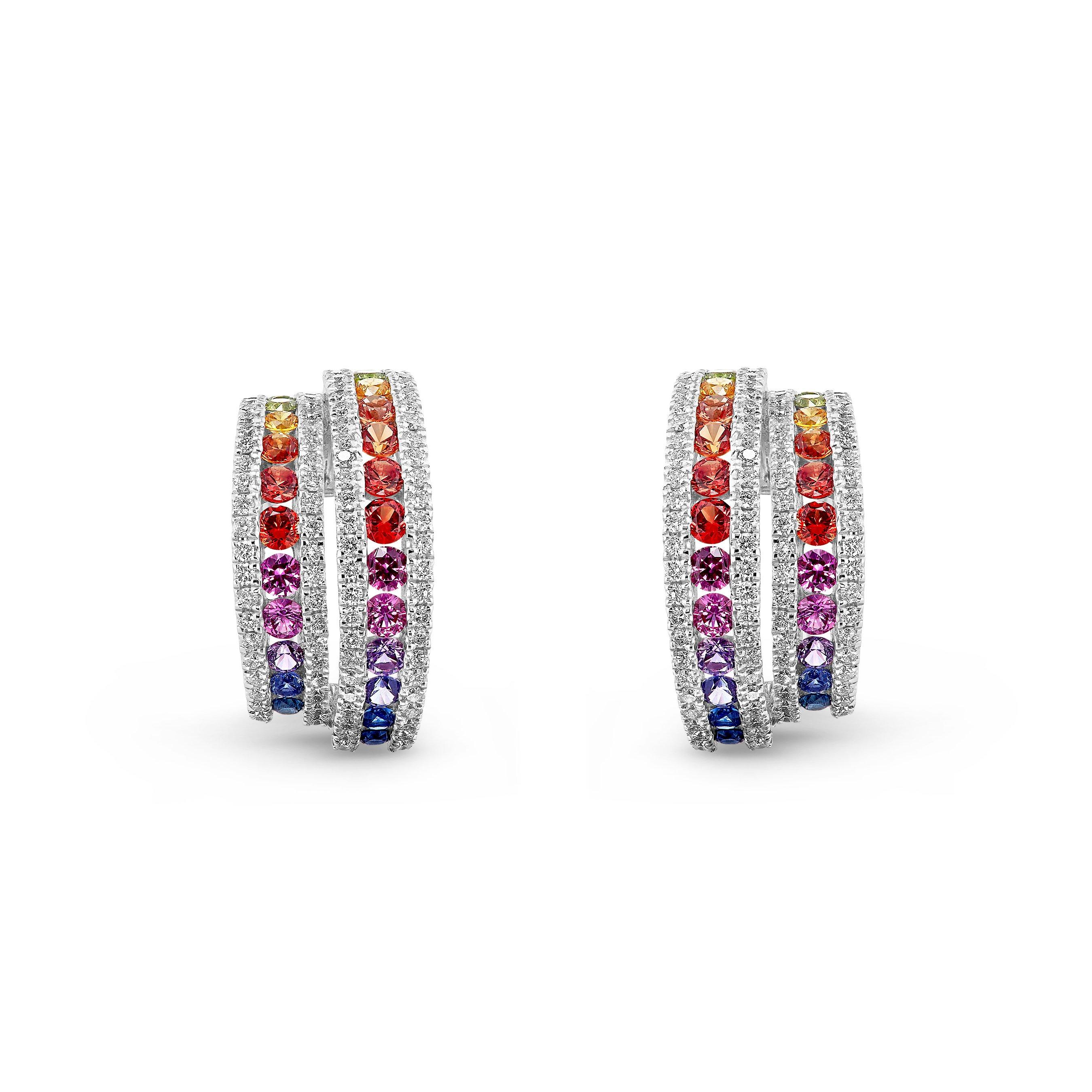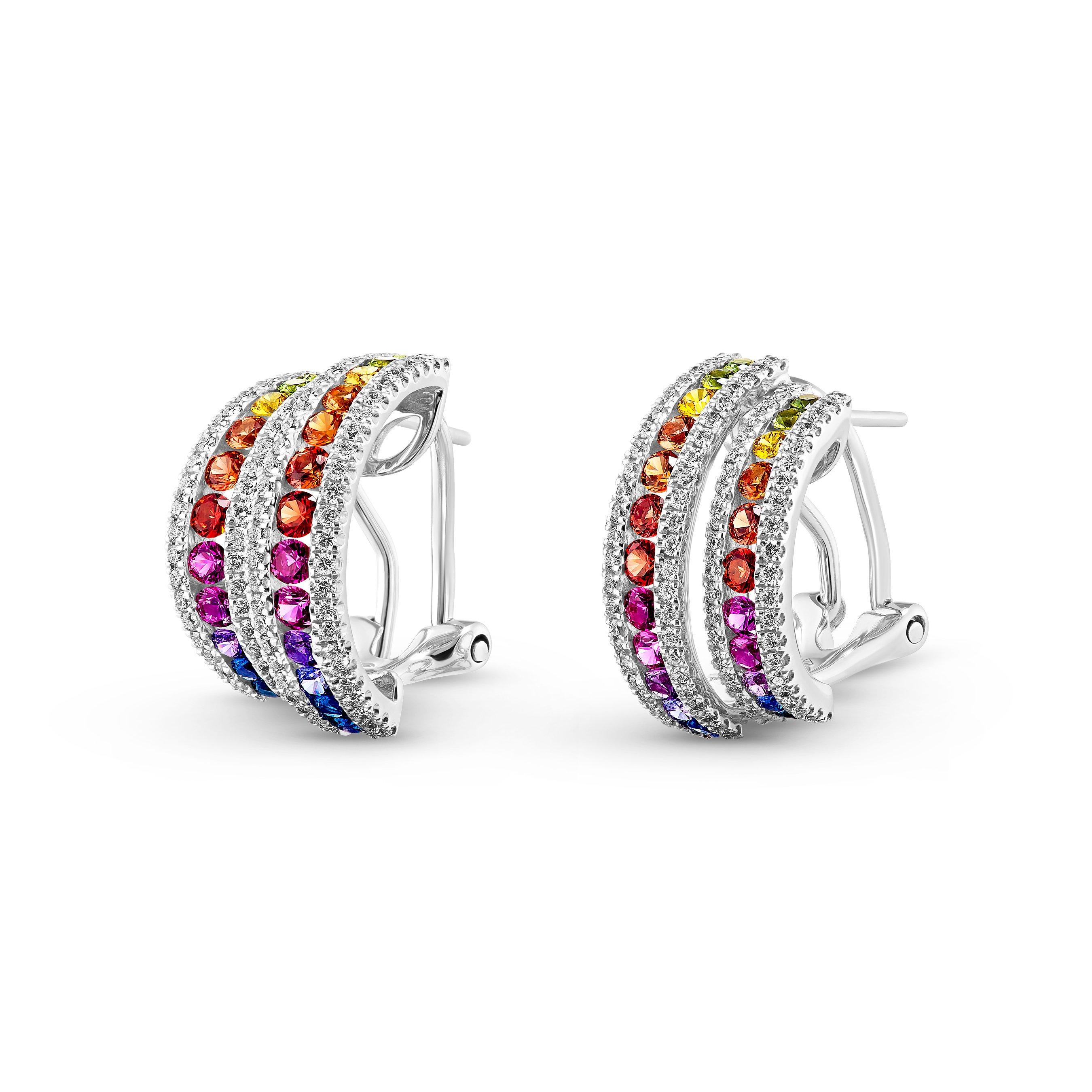 Make every moment sparkle with these 18ct White Gold Diamond and Sapphire Hoop Earrings. Adorned with a dazzling combination of round brilliant diamonds and vibrant sapphire to create a playful yet elegant display of colour and light.
