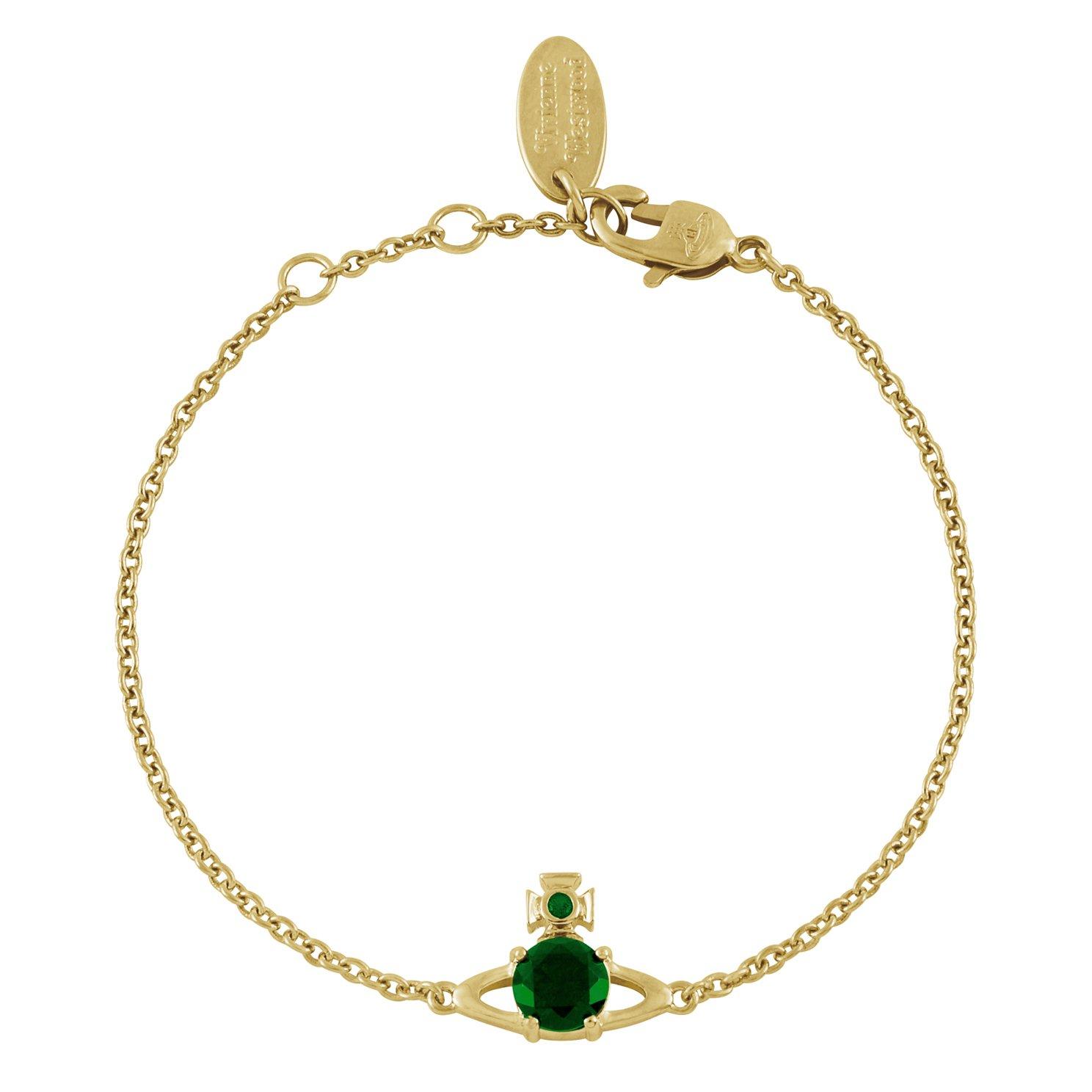 Blending classic elegance with a contemporary edge, this Vivienne Westwood Reina Yellow Gold Tone Cubic Zirconia Bracelet is perfect for elevating both your everyday and evening styles. Featuring the signature orb motif, set with a striking green cubic zirconia at its centre, and secured with a lobster clasp, this distinctive piece brings a touch of designer style to every moment.