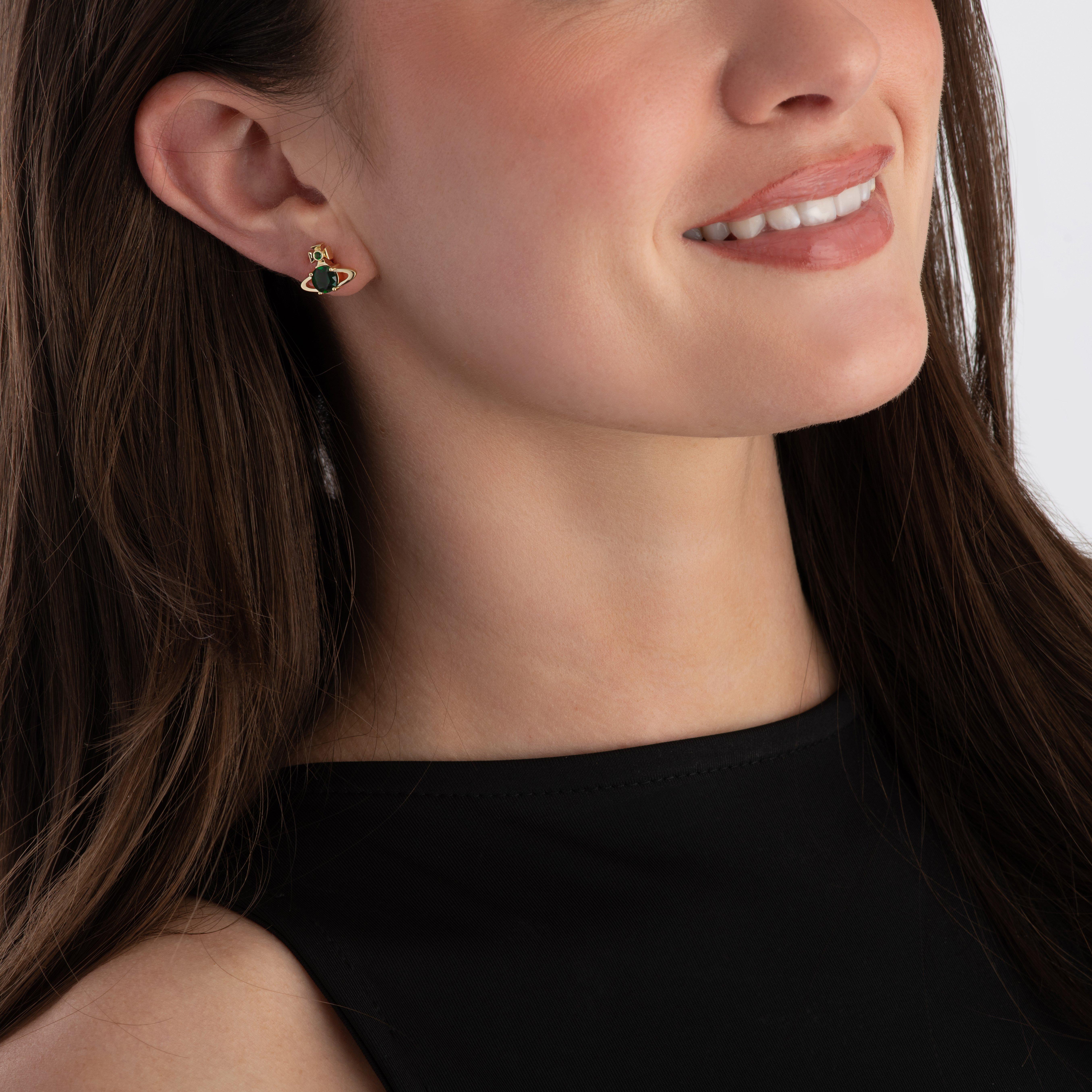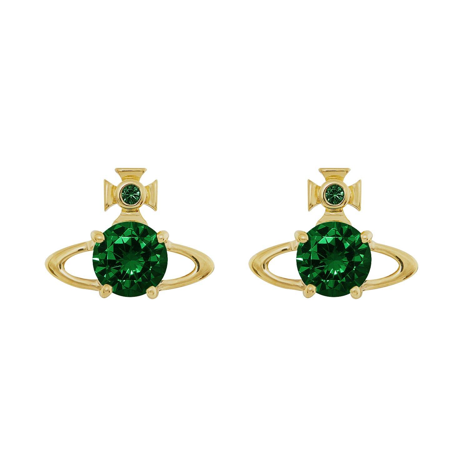 Add a touch of iconic elegance to your look with these Vivienne Westwood Reina Yellow Gold Tone Cubic Zirconia Stud Earrings. Crafted with a luminous yellow gold tone finish, each earring features a sparkling green cubic zirconia centrepiece, beautifully complemented with the brand’s signature orb motif. Designed for both style and comfort, they fasten securely with classic butterfly clasps, perfect for everyday wear or adding a statement touch to your evening ensemble.