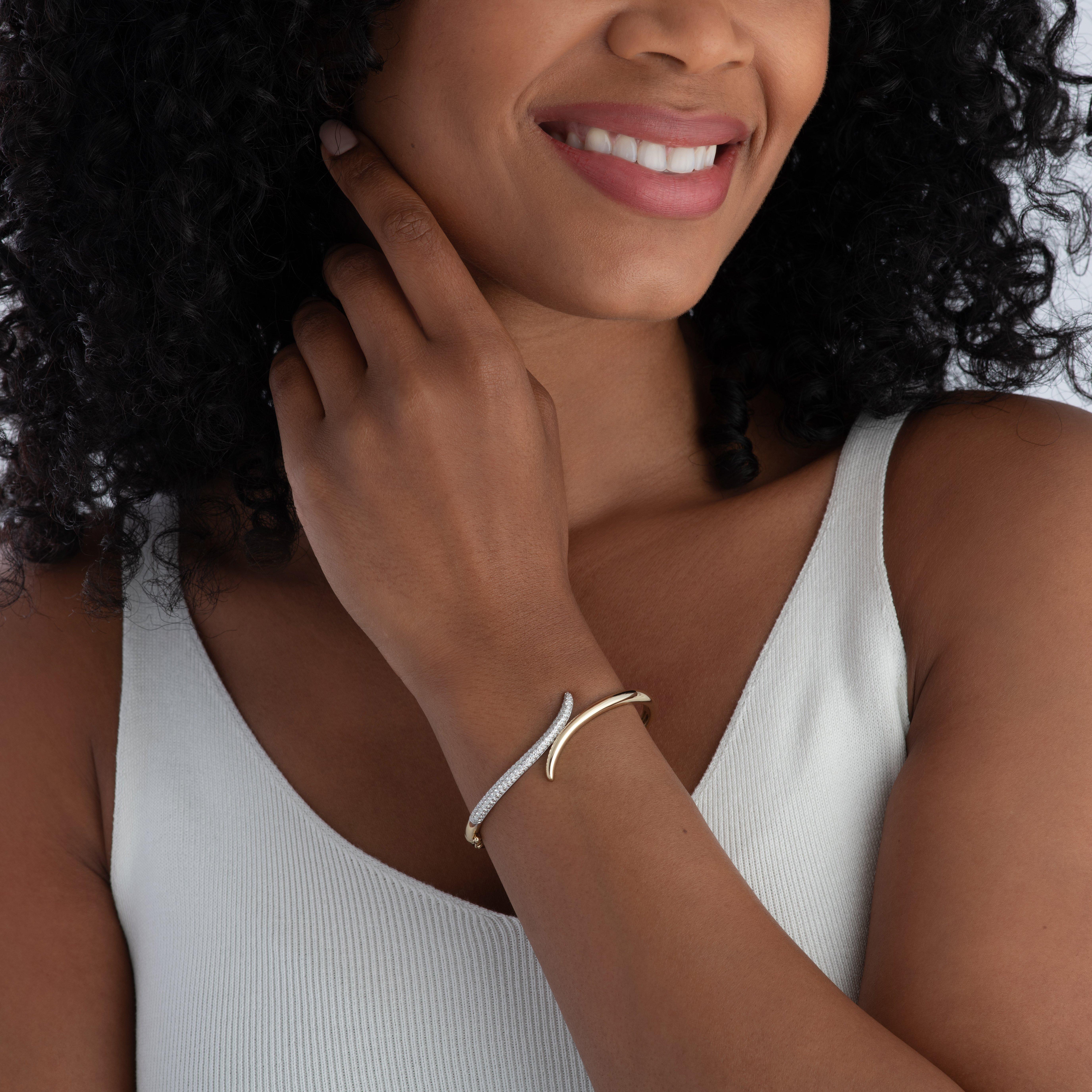 Capturing the beauty of connection, this Essence 9ct Yellow Gold and White Gold Diamond Bangle is where warmth meets brilliance. The 9ct yellow gold backdrop sweeps gracefully around the wrist, meeting a 9ct white gold curve adorned with pavé-set diamonds that shimmer with every movement. Together the elegant curves flow in perfect harmony and represent those relationships that mean the most.