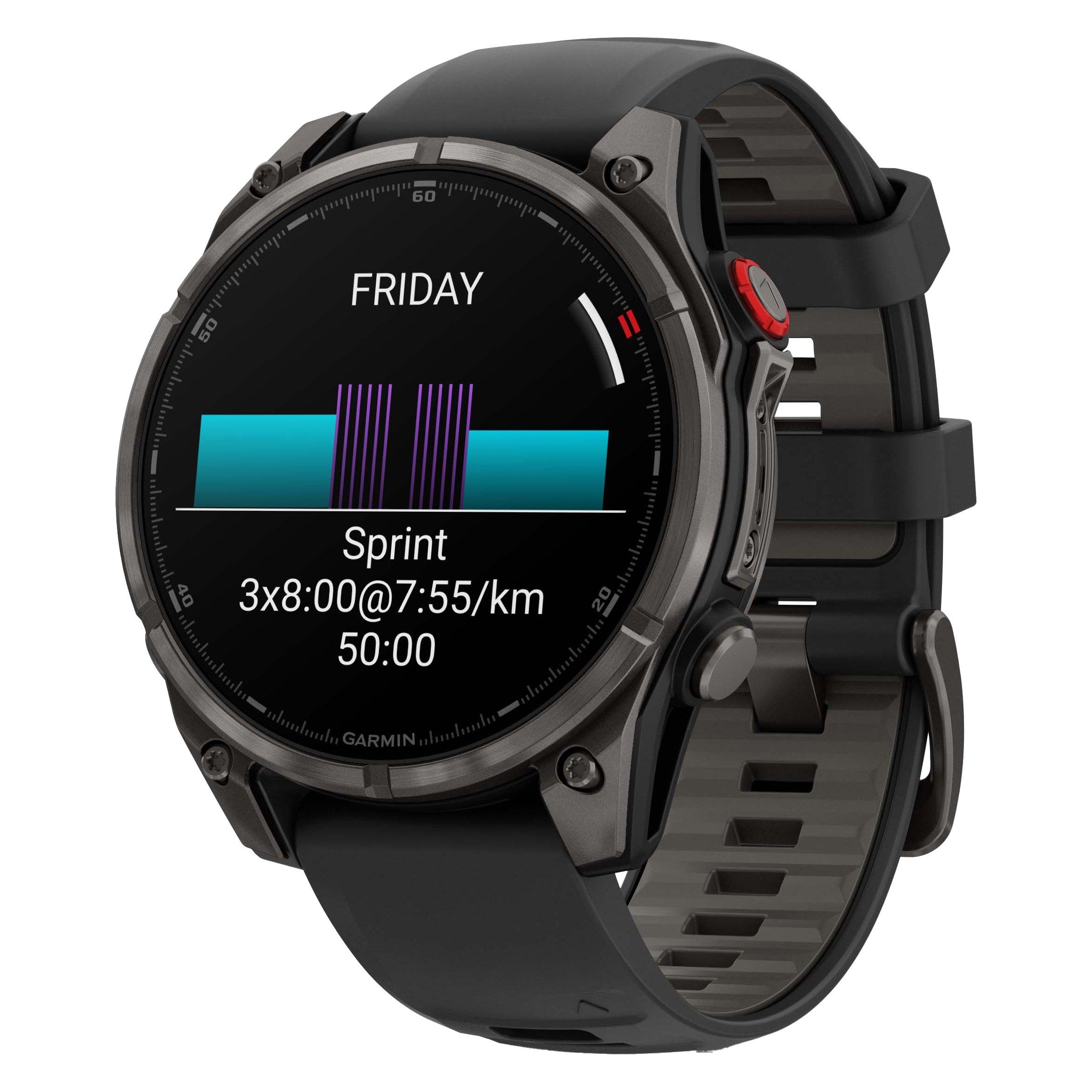 Rugged design with a bright 1.4" AMOLED touchscreen display, titanium bezel, scratch-resistant sapphire lens