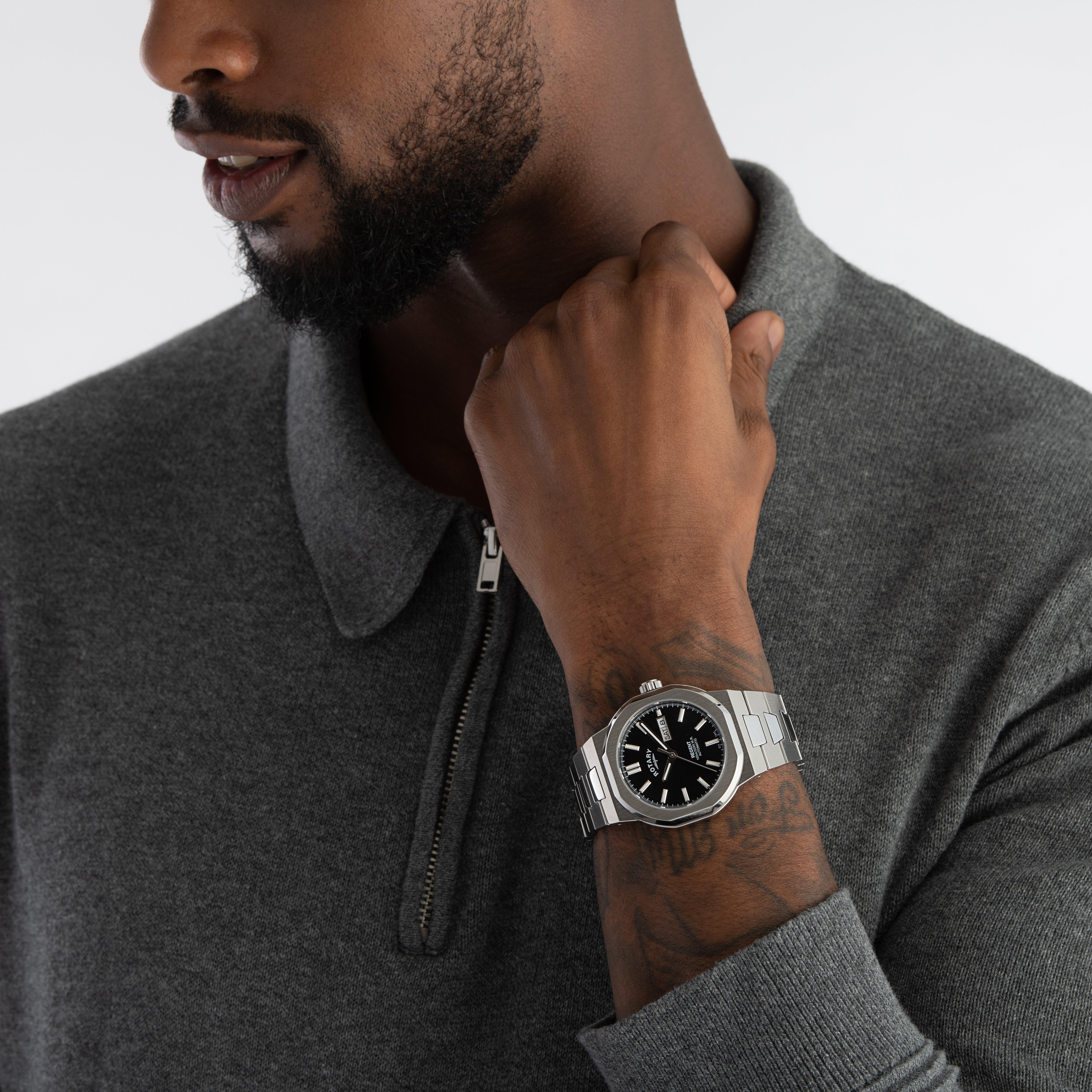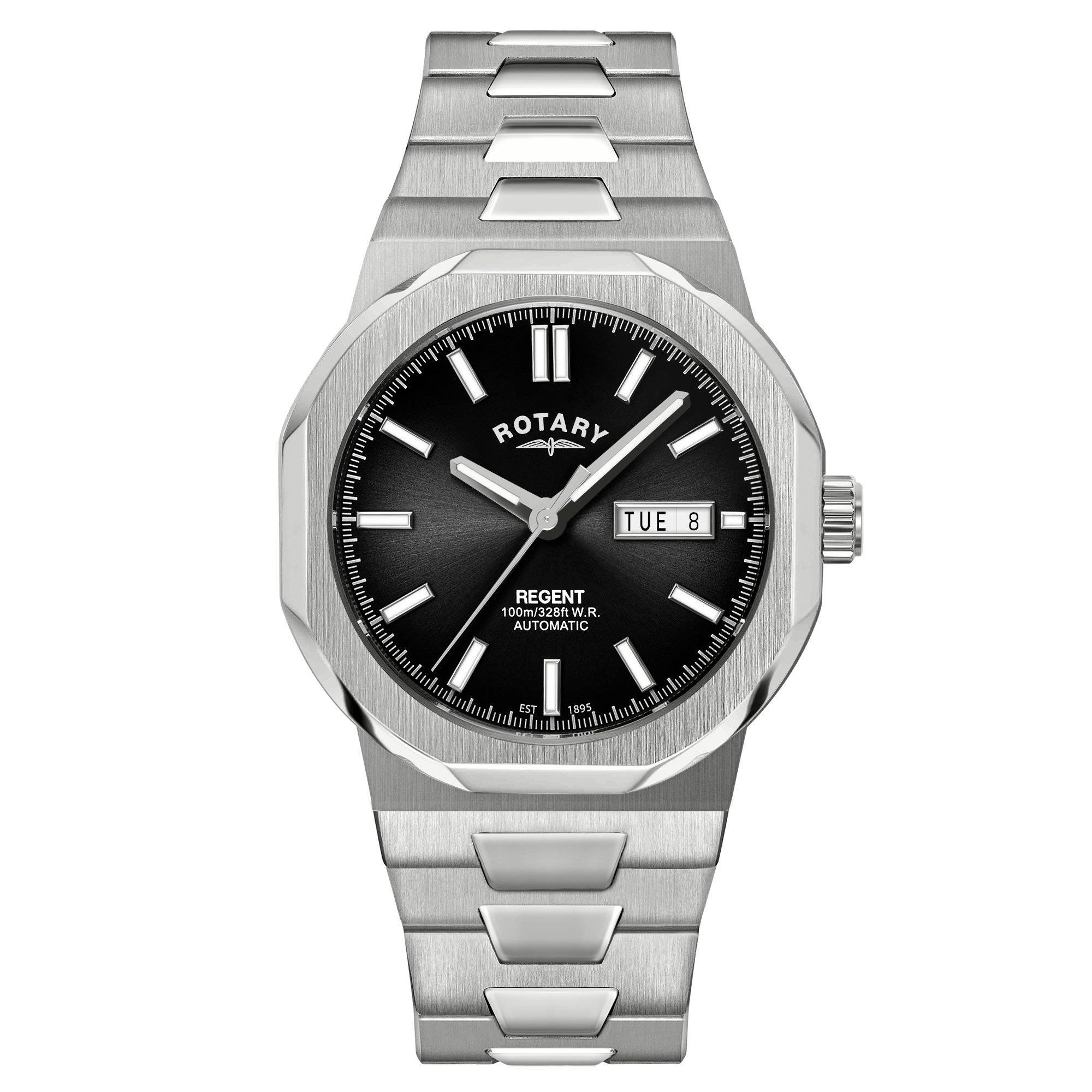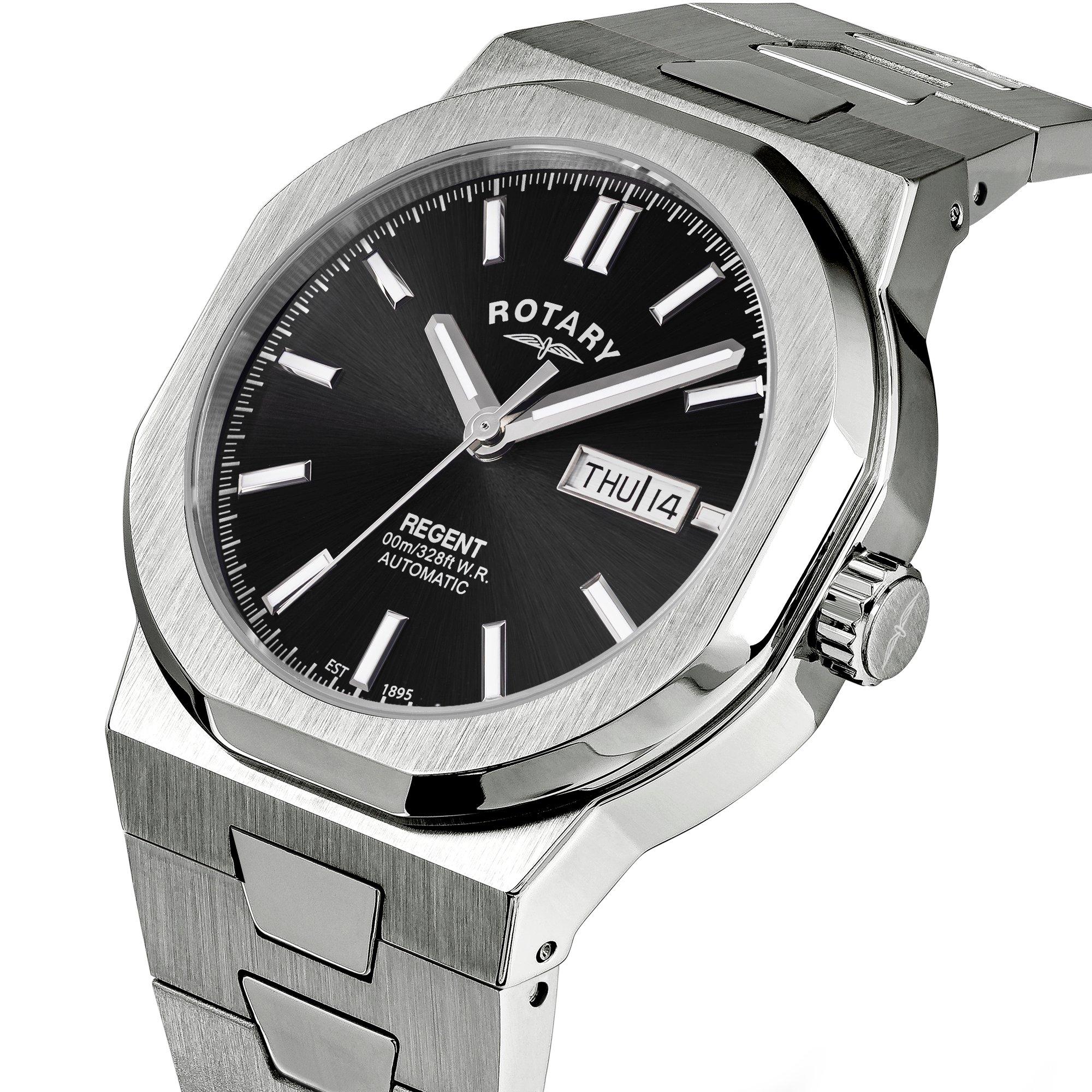 Embracing a powerful and bold design, this Rotary Regent 40mm Automatic Watch is a captivating addition to your watch collection. Designed with an angular case that allows light to create shimmering effect and a black sunray dial, this timepiece offers a sport-chic aesthetic with and abundance of sophistication.