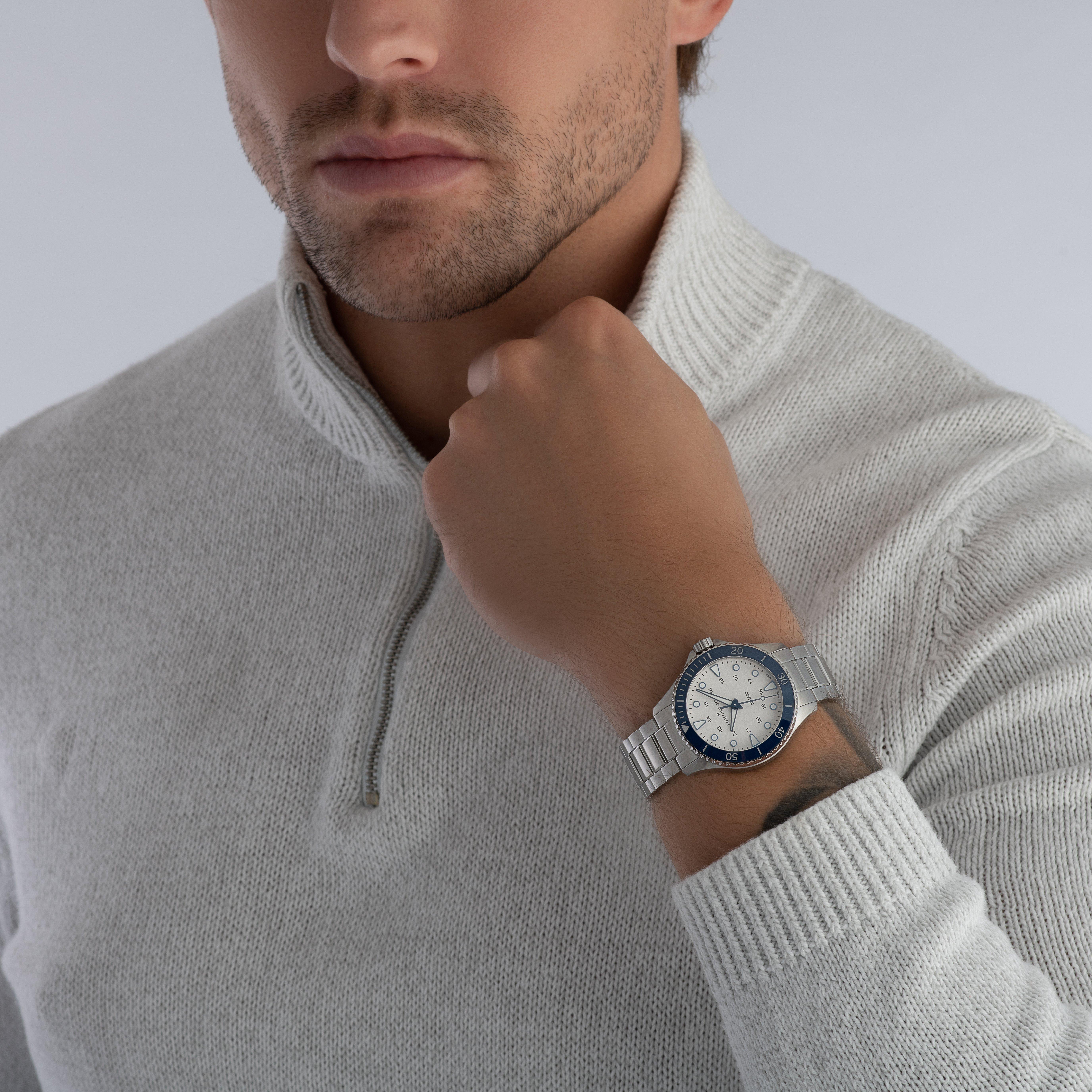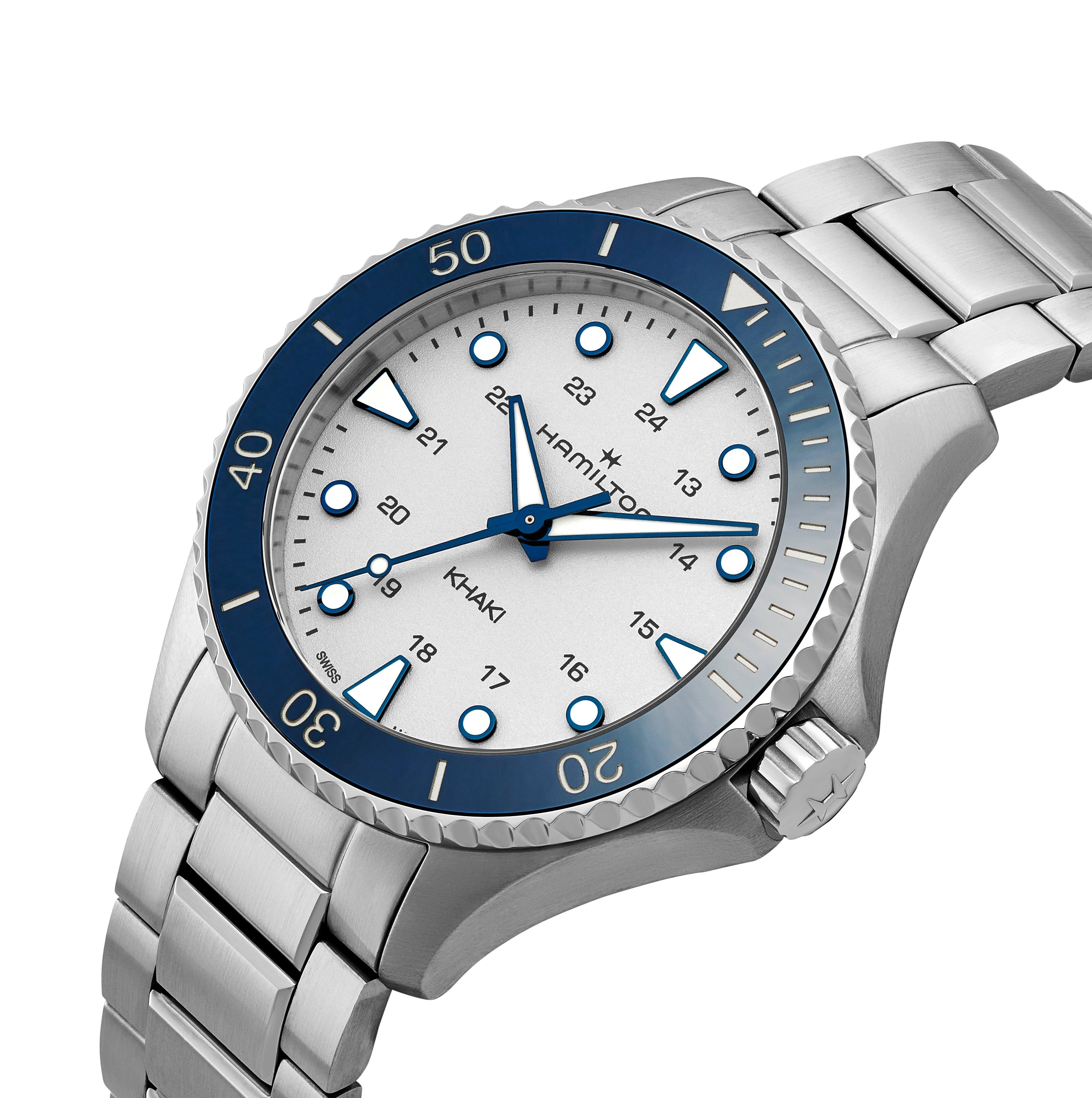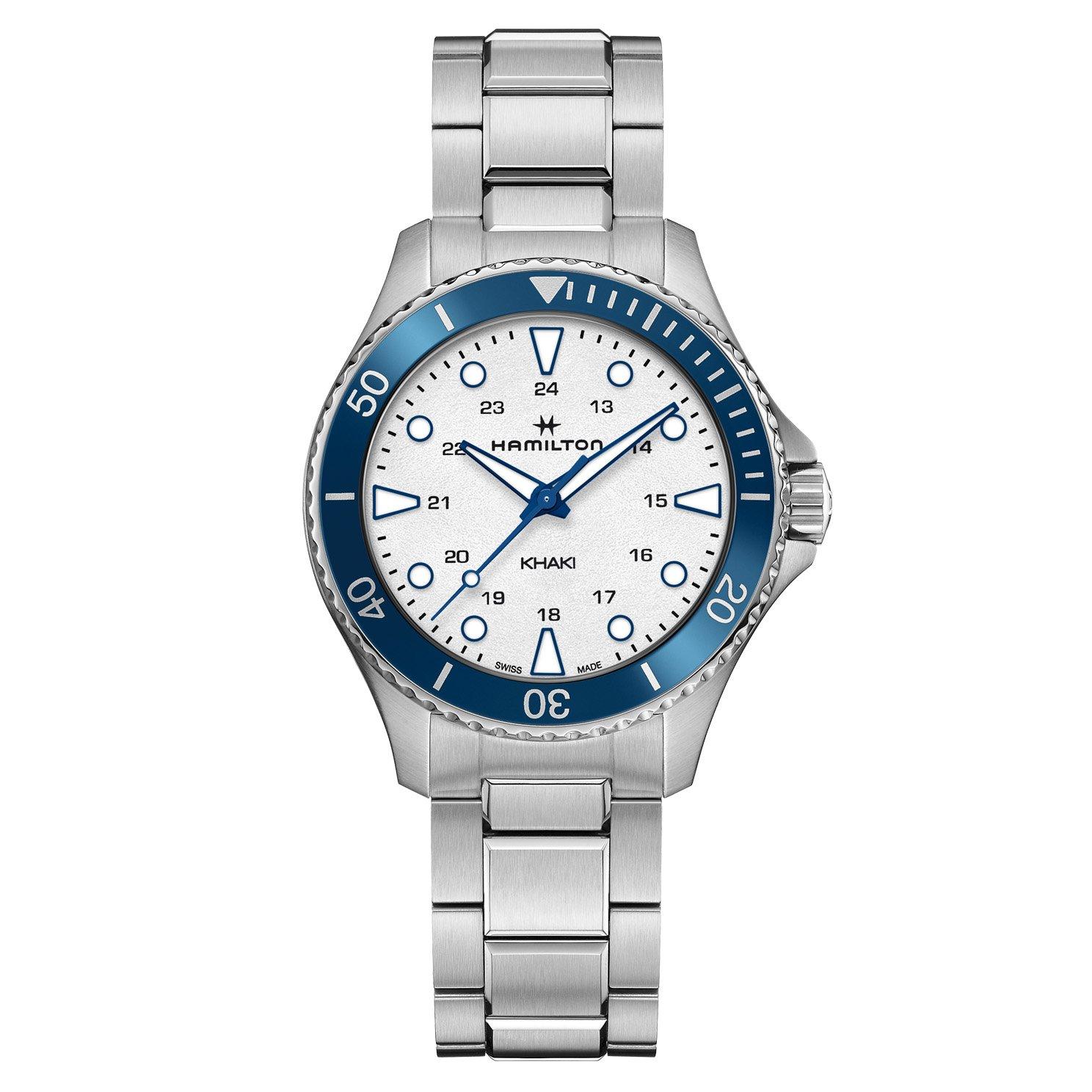 Take on every adventure with maritime sophistication with this Hamilton Khaki Navy Scuba 37mm Watch. Designed with a striking blue bezel that beautifully contrasts against the white dial, this timepiece obtains excellent performance and functionality.