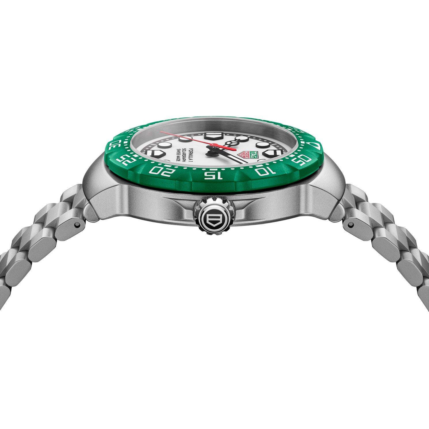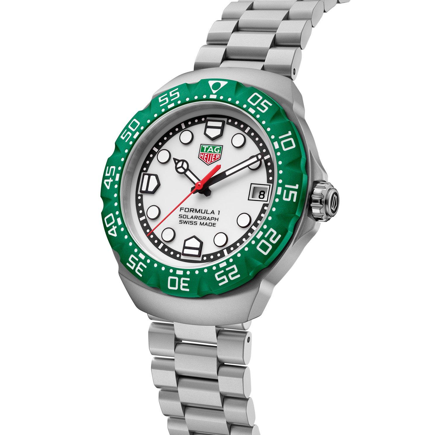 Channelling the brand’s racing heritage into a compact and high energy design, this TAG Heuer Formula 1 Solargraph 38mm Watch takes inspiration from the pitlane clocks. Designed with red, green, and white accents that echo TAG Heuer’s motorsport roots, this confident companion truly captures both colour and speed in motion.