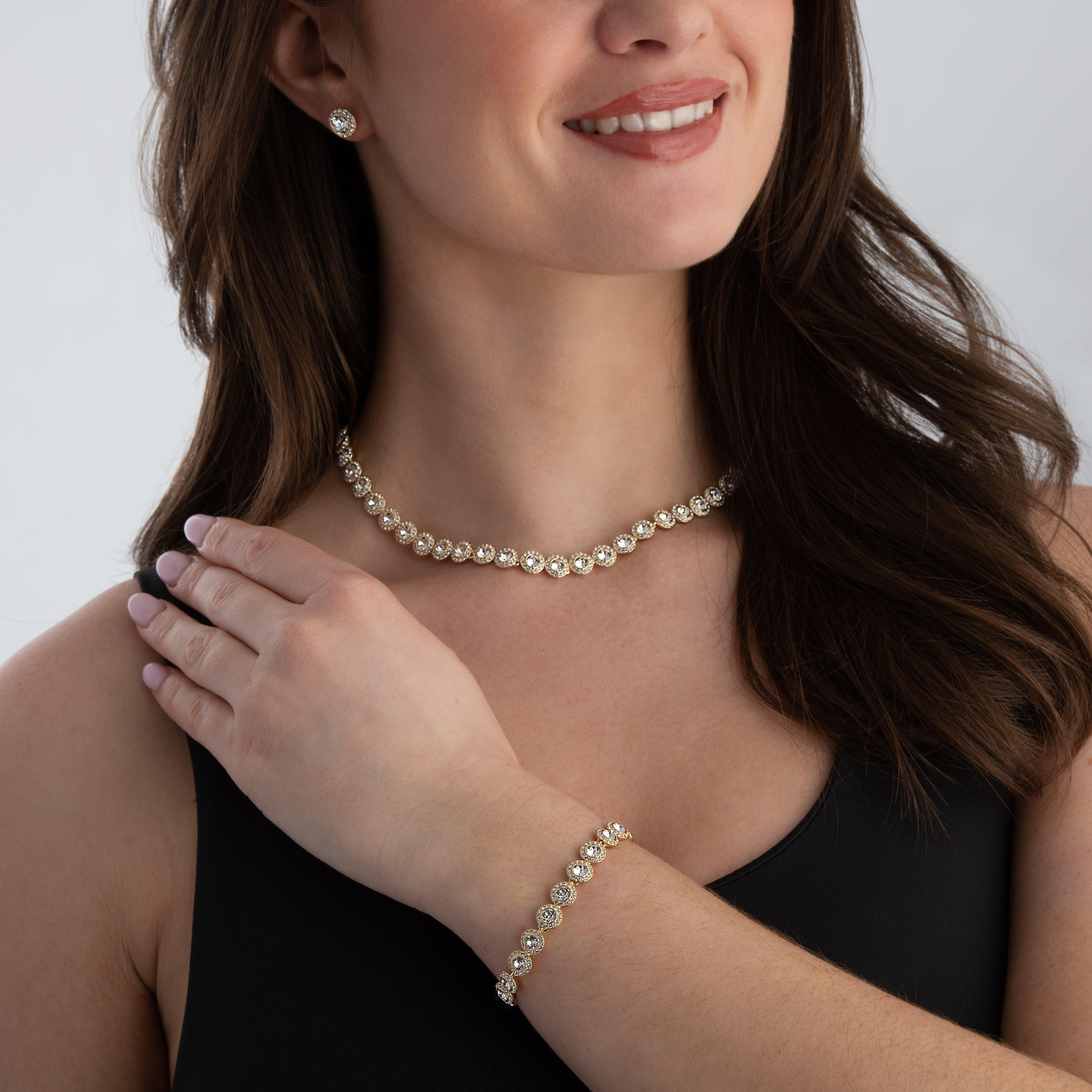 Radiating timeless elegance, this Swarovski Una Angelic Yellow Gold Tone Crystal Necklace, Bracelet and Earrings Set shines with effortless sophistication. Bringing together a beautifully coordinated necklace, bracelet and pair of stud earrings, each piece adorned with Swarovski crystals to create exceptional brilliance and a luxurious finish.
