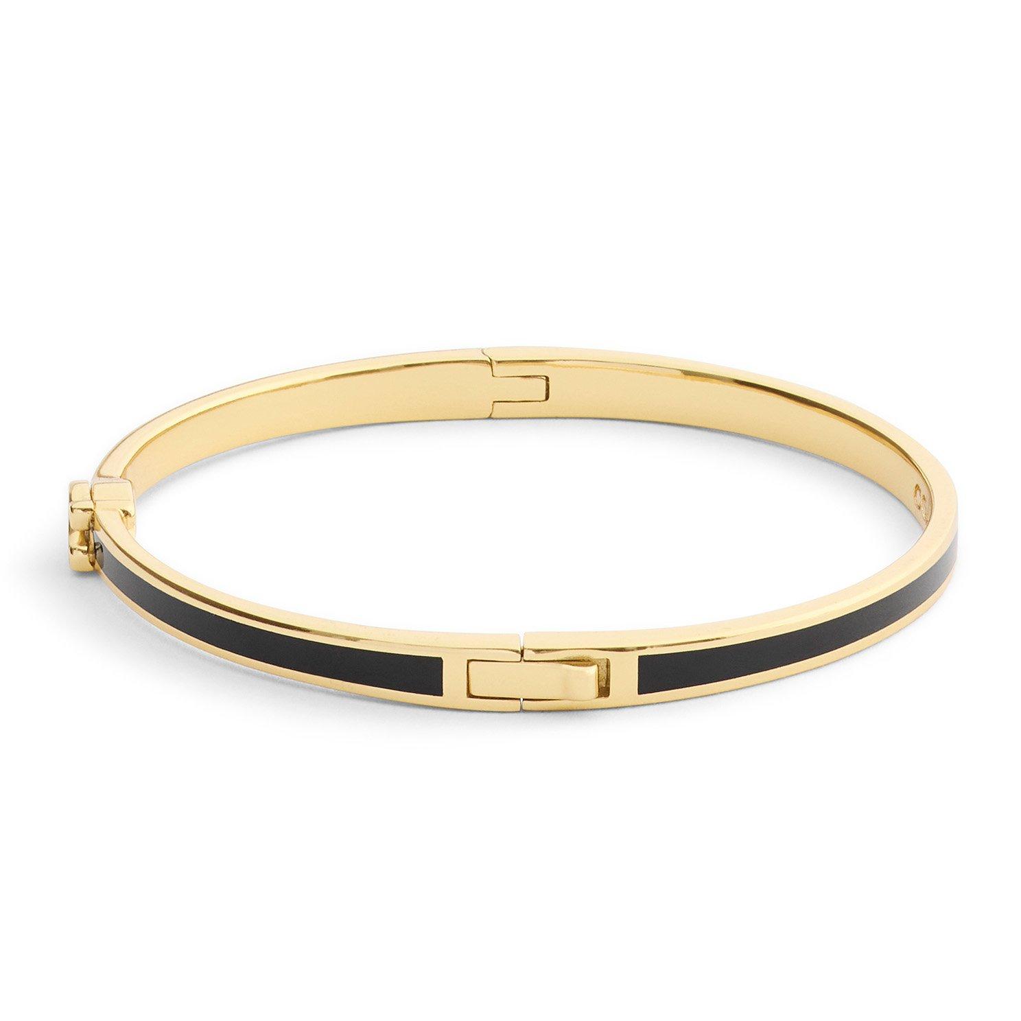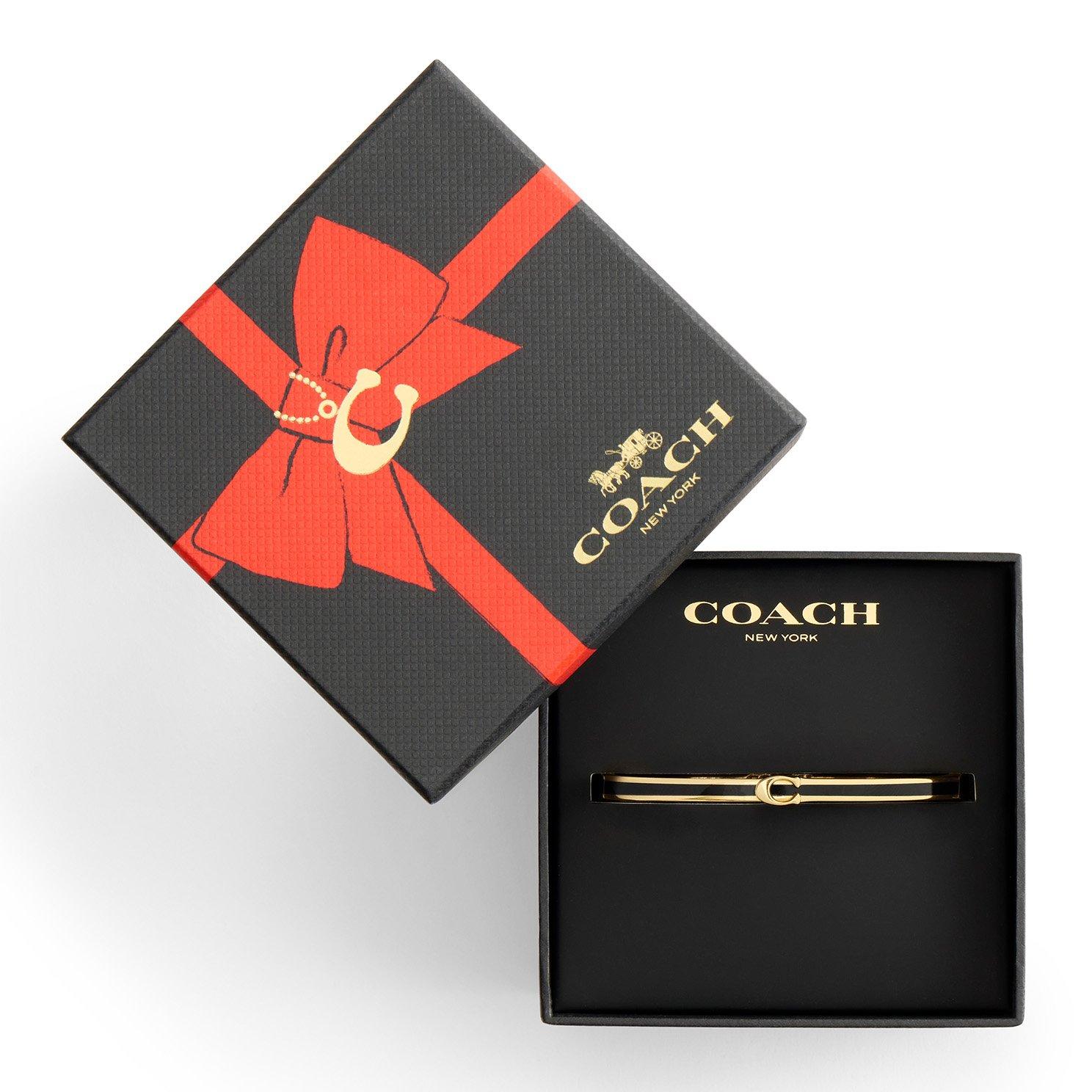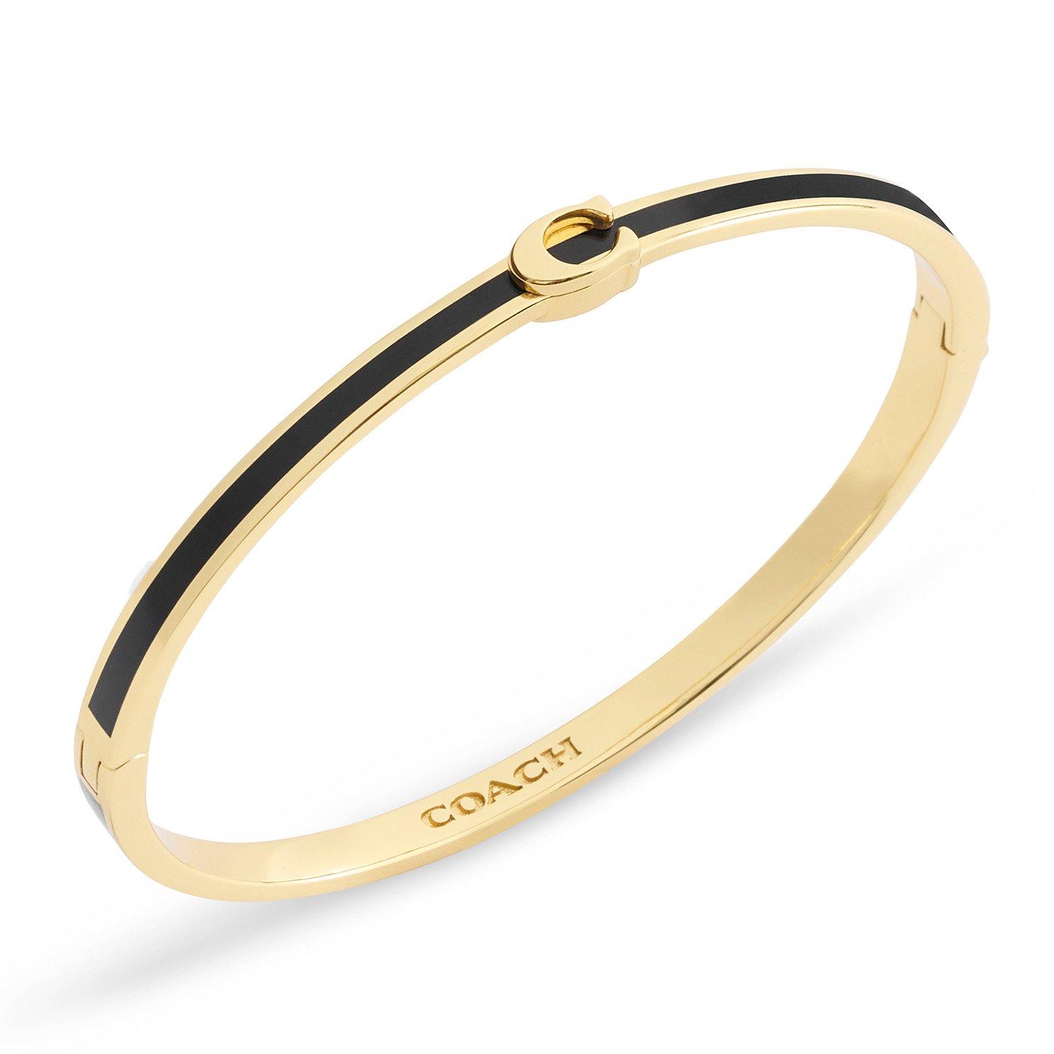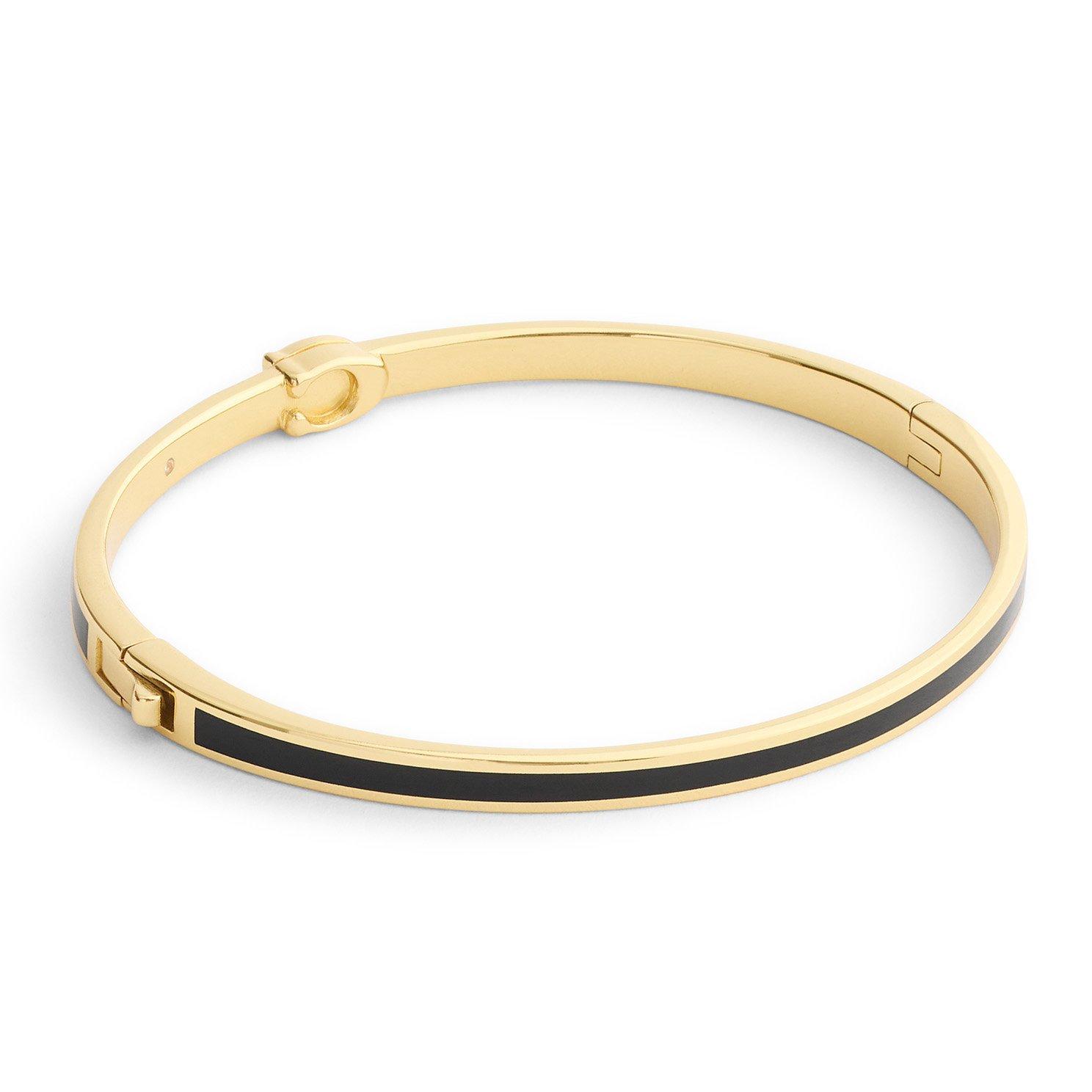 A timeless expression of refined elegance, this Coach Signature C Yellow Gold Tone Bangle is accented with sleek black enamel and the iconic signature C for a sophisticated contrast. Ideal for layering with other bracelets or worn solo for understated style, this piece embodies Coach’s signature blend of modern design and classic craftsmanship.