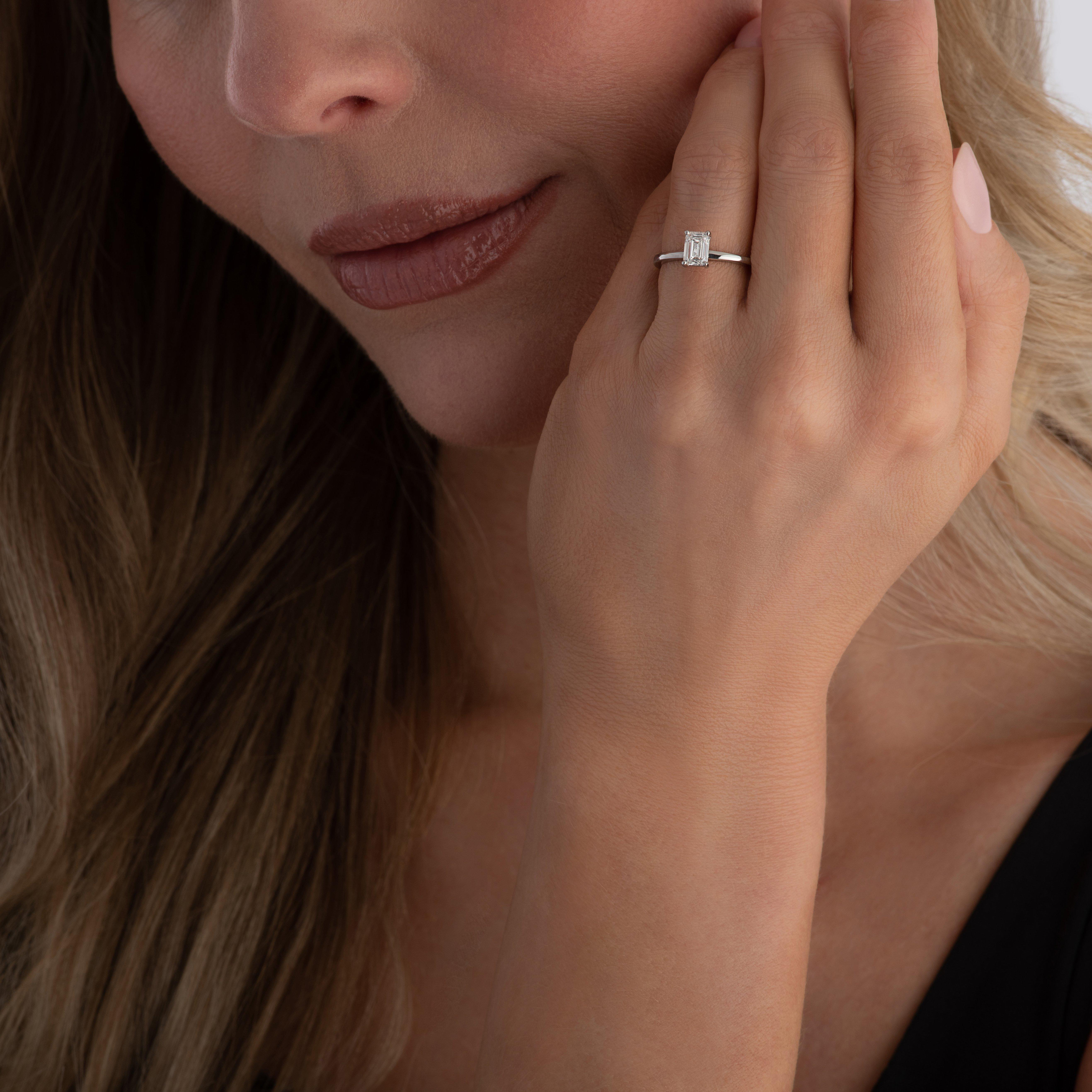 Designed with both precision and grace, this Platinum Diamond Emerald Cut Solitaire Engagement Ring exudes timeless elegance. At its heart sits a striking emerald cut diamond, held securely in a classic four-claw setting that elevates the diamond and allows light to dance through each sparkling facet.