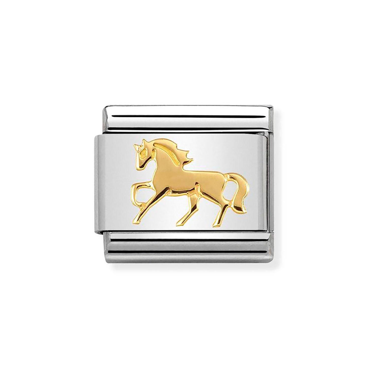 Shop CharmsCelebrate freedom with this Nomination Composable Stainless Steel and Yellow Gold Plated Horse Charm, featuring a galloping horse symbol in bonded yellow gold. Bold, elegant, and full of character, this charm brings a dynamic touch to your customisable bracelet.