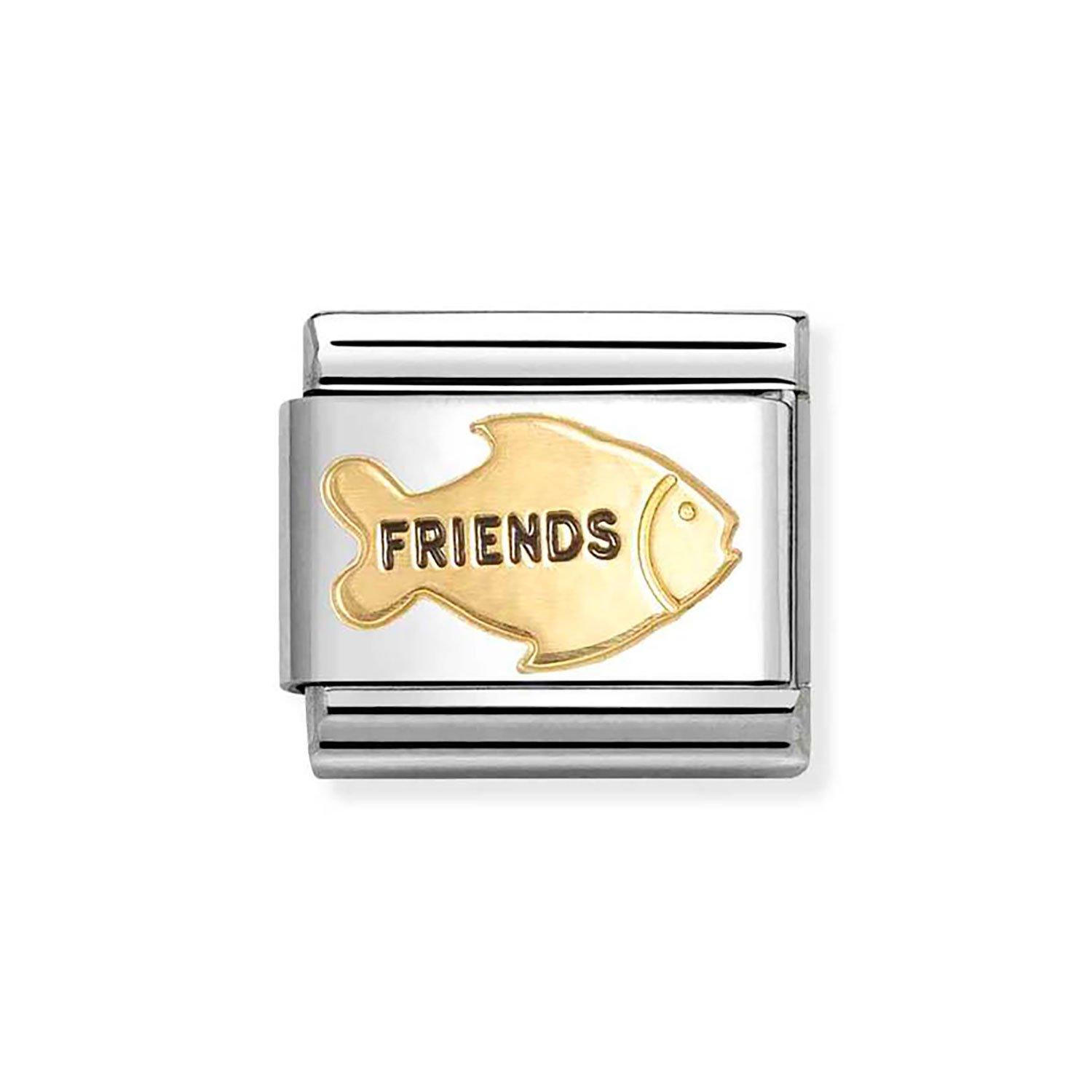 Shop CharmsCelebrate the friends who mean the most with this Nomination Composable Classic Stainless Steel and Yellow Gold Plated Fish Friends Charm. Featuring a yellow gold fish symbol with the word ‘Friends’ in sleek black enamel, this design blends warmth and sentiments in one elegant piece.