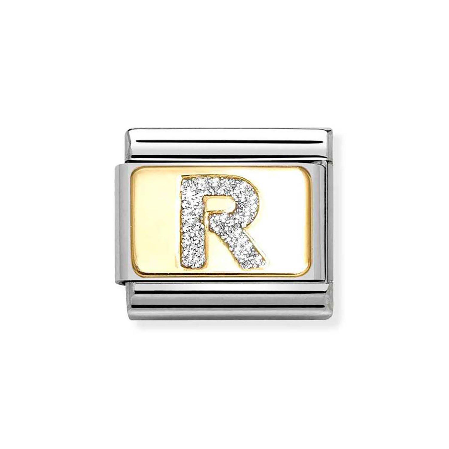 Shop CharmsCelebrate personal style with this Nomination Composable Stainless Steel and Yellow Gold Plated Glitter Initial R Charm. Featuring yellow gold detailing and a shimmering silver glitter initial ‘R’, this charm is designed to add a meaningful touch to your bracelet.